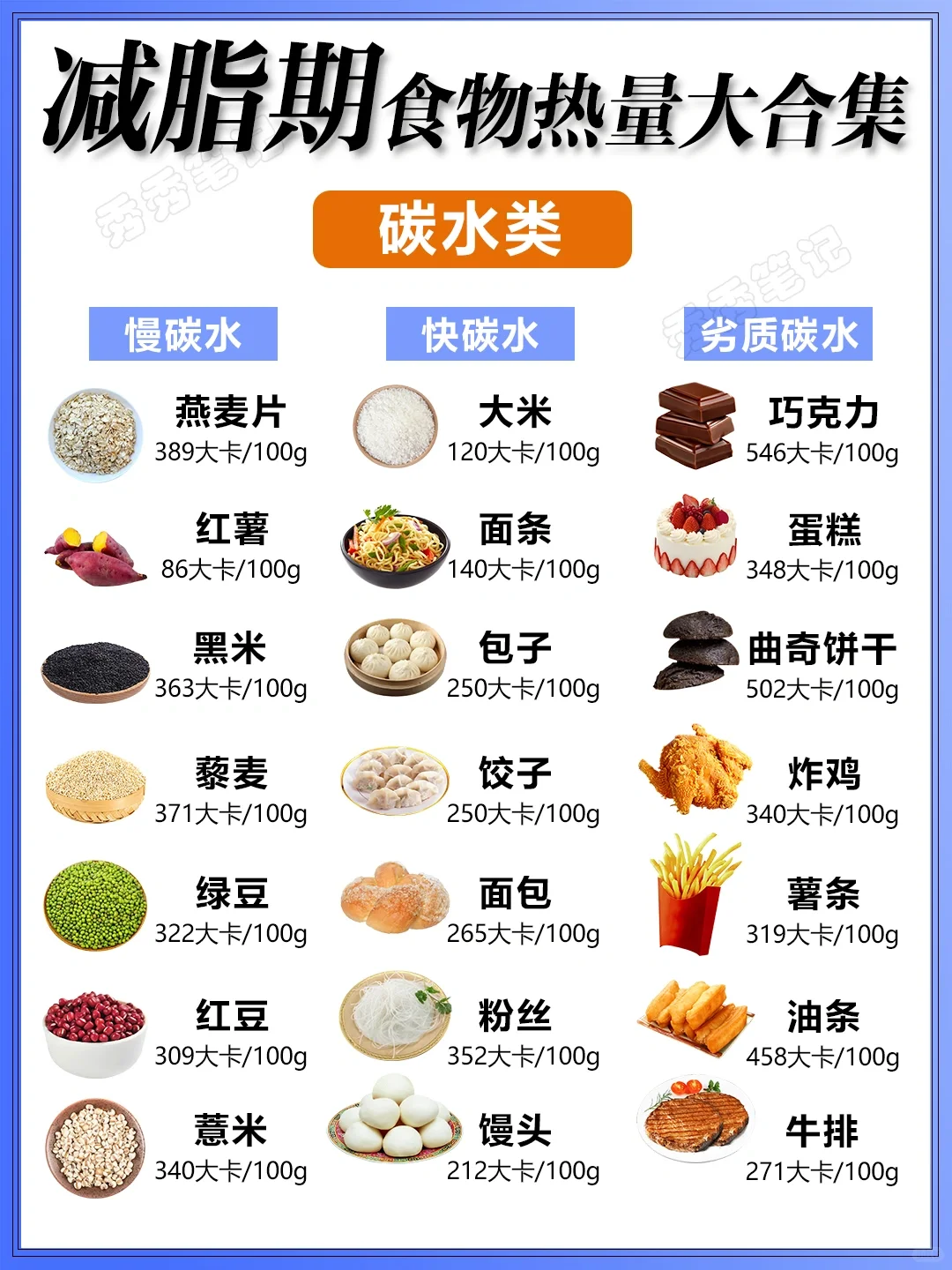 ✅减脂期不建议食用的12种碳水类食物及其卡路里含量(每100克):