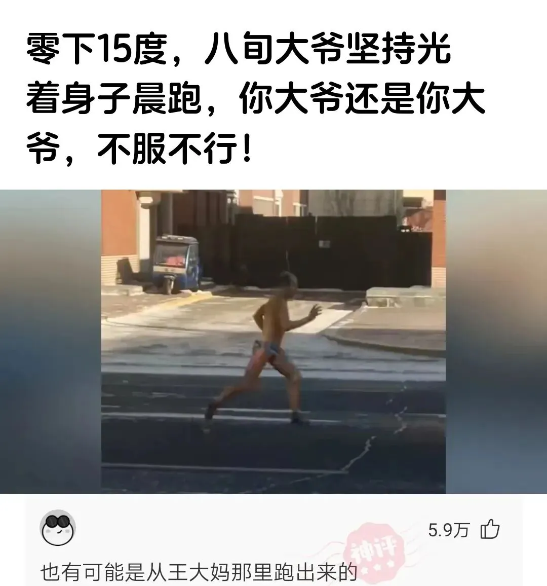 冻哭!零下15度大爷光着腚跑步!网友:这老宝贝儿火力比暖气还足