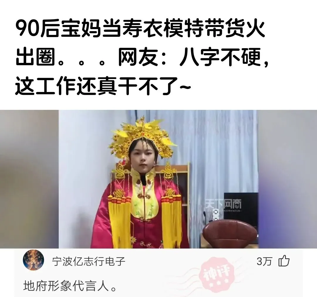 神回复:90后宝妈当寿衣模特带货火出圈...网友:八字不硬,这工作还真干不了~