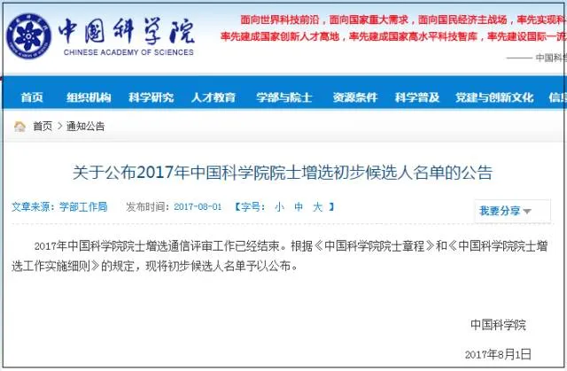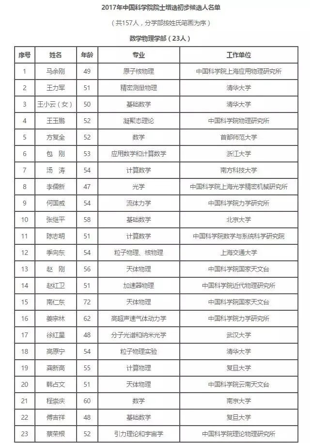 近日,中国科学院公布了2017年院士增选初步候选人名单,157位科学家“榜上有名”。