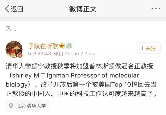 这件事要始于5月3日一条微博的持续发酵——世界顶尖结构生物学家、清华大学生命科学学院教授颜宁近日受聘普林斯顿大学分子生物学系Shirley M. Tilghman终身讲席教授。