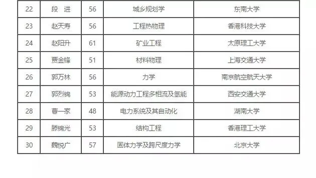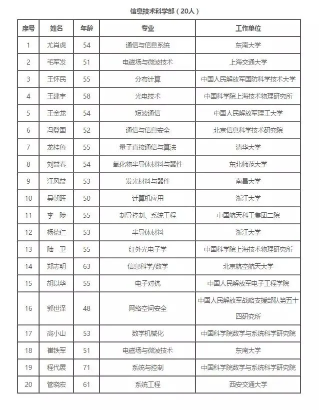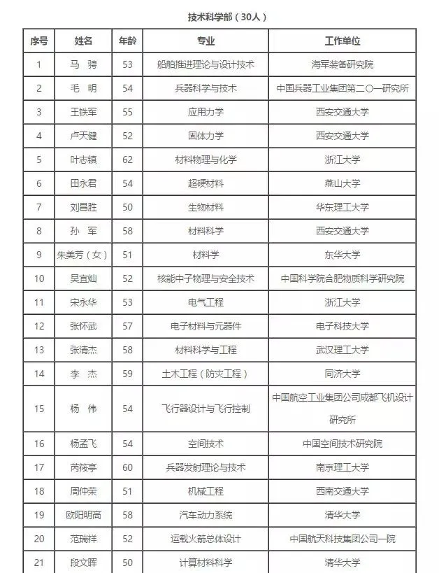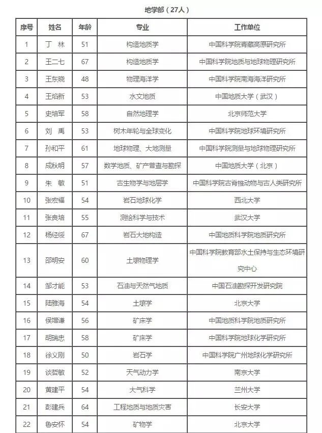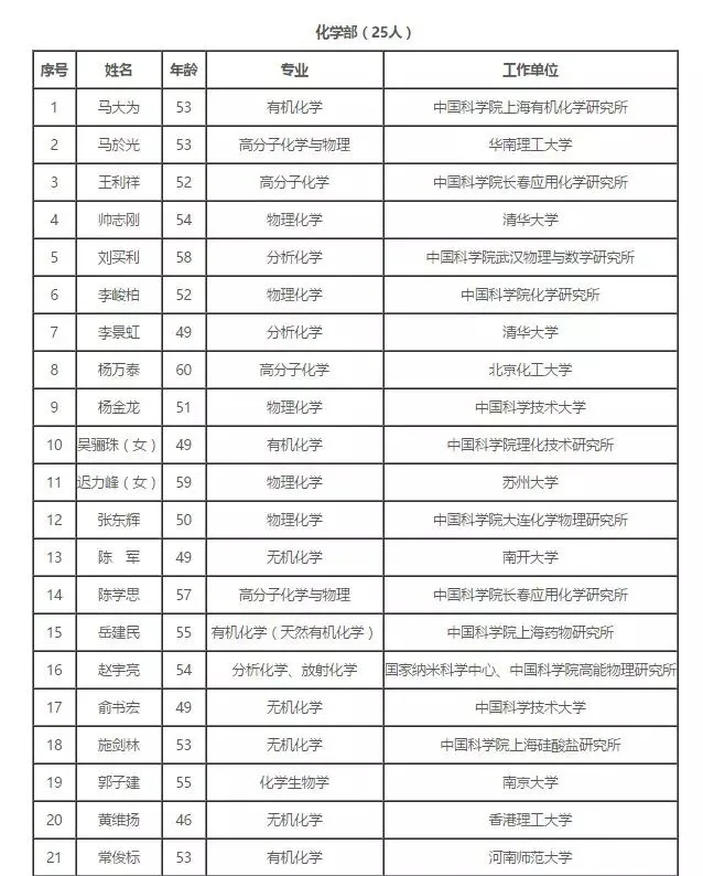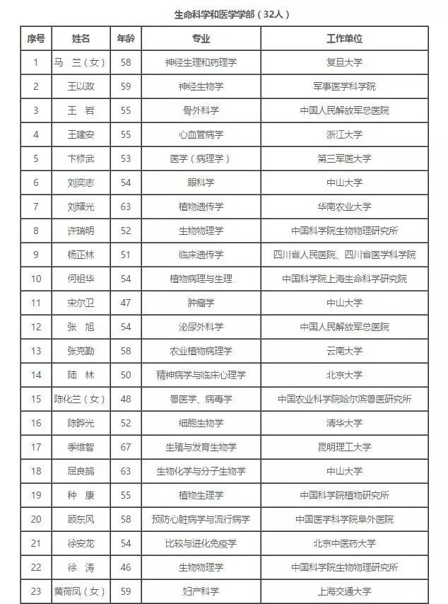 2017年中国科学院院士增选初步候选人名单