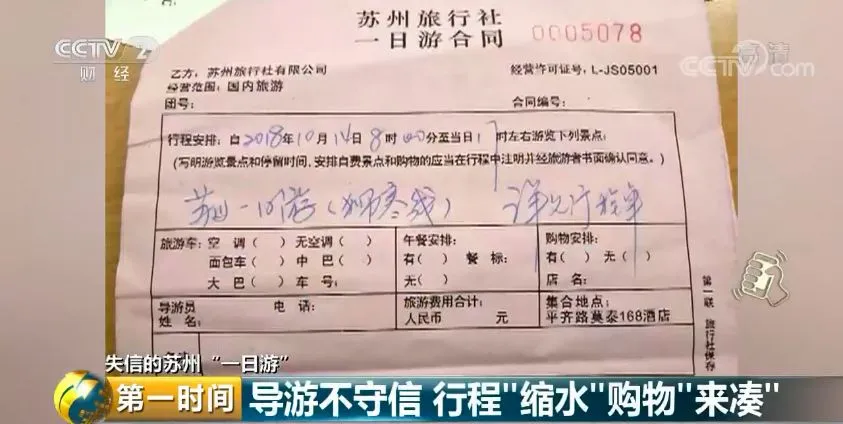 变更旅游行程,购物店包装成旅游景点,旅游合同就这样变成了一纸空文。而记者报名参加的“周庄一日游”,这家旅行社甚至连旅游合同都不签,只开了一张收据单。一天游下来,购物时间长达3小时,而游玩时间不足2小时。这到底是“一日游”还是“一日购”呢?