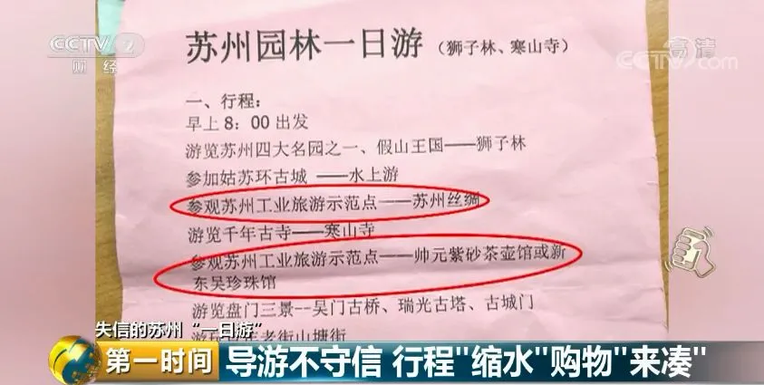 针对苏州“一日游”存在导游不守信、行程缩水等问题。25日,苏州市旅游局出台了《关于央视“失信的苏州”“一日游”报道中反映问题的处置方案》,表示对失信“一日游”“从严从快处理”。