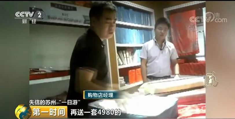 购物店经理得知游客在苏州参加“一日游”时去过其他丝绸购物店,就当场宣布所有产品按工厂批发价销售,并且买一送一。