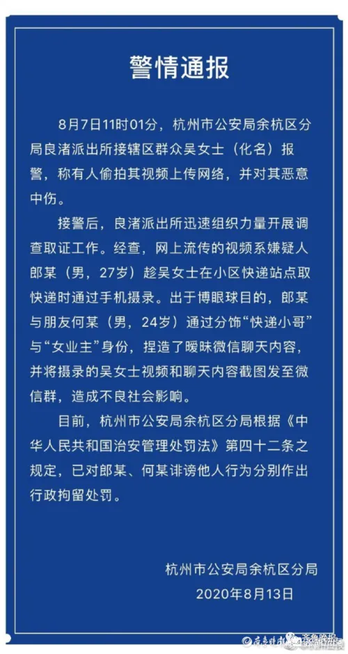 8月13日,余杭警方发布通报,两位嫌疑人郎某和何某因诽谤他人被行政拘留9日。