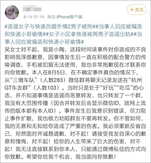 而将谣言转发扩散的陶某,则在郎某、何某被警方行拘后次日,在微博上向吴女士公开道歉。