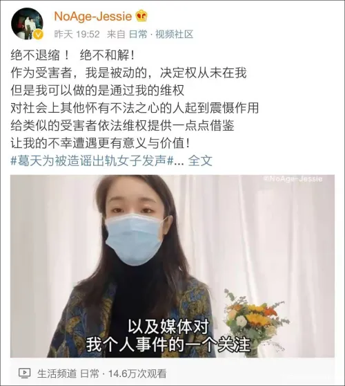 12月10日晚8时许,吴女士@NoAge-Jessie 在其微博上首次发布个人录制的视频,直接面对公众发声。