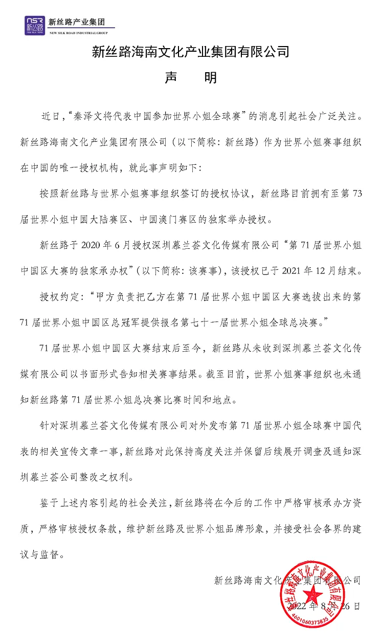 新丝路海南文化产业集团有限公司26日发布声明:按照新丝路与世界小姐赛事组织签订的授权协议,新丝路目前拥有至第 73届世界小姐中国大陆赛区、中国澳门赛区的独家举办授权。新丝路于2020年6月授权深圳慕兰荟文化传媒有限公司“第71届世界小姐中国区大赛的独家承办权”,该授权已于2021年12月结束。