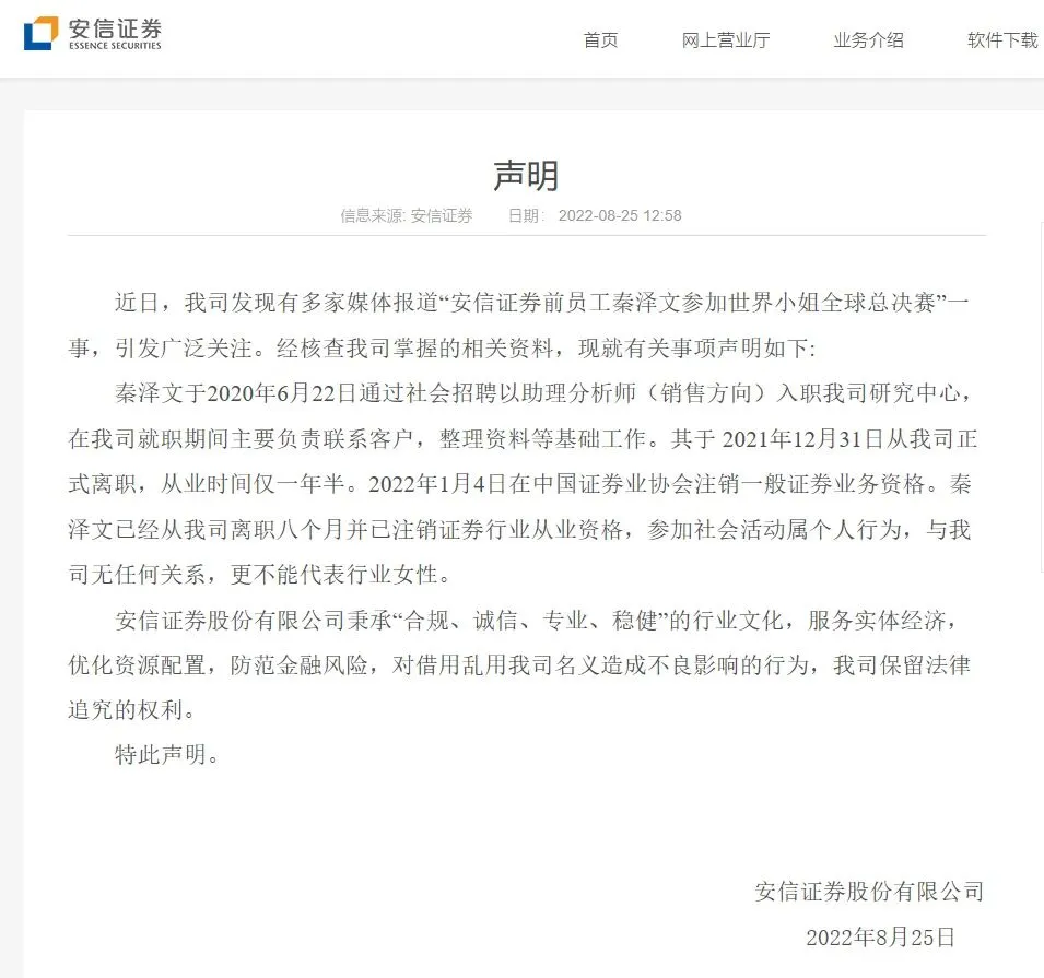 安信证券8月25日发布声明称,秦泽文已经从公司离职八个月并已注销证券行业从业资格,参加社会活动属个人行为,与公司无任何关系,更不能代表行业女性。并称,对借用乱用公司名义造成不良影响的行为,安信证券保留法律追究的权利。