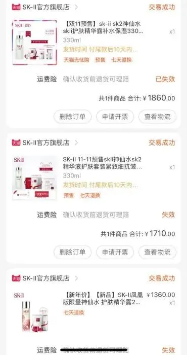 除此之外,林鹏已经连续多年购买知名护肤品牌的“神仙水”,每年搞活动时都会囤货。他笑称自己“翻翻购买记录就能看出来它这几年是怎么涨价的”。