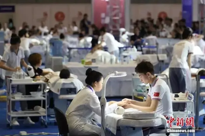 资料图:2018中国技能大赛现场,美容师正在给体验者做指甲。张亨伟 摄