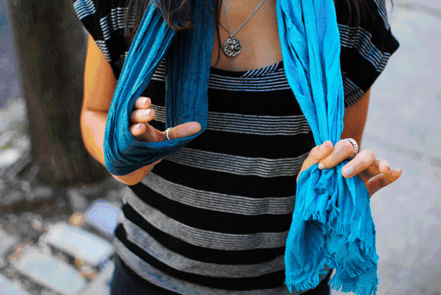 先将围巾一头绕两圈,再把另一边拉出对角,系在圈圈上就好啦!
