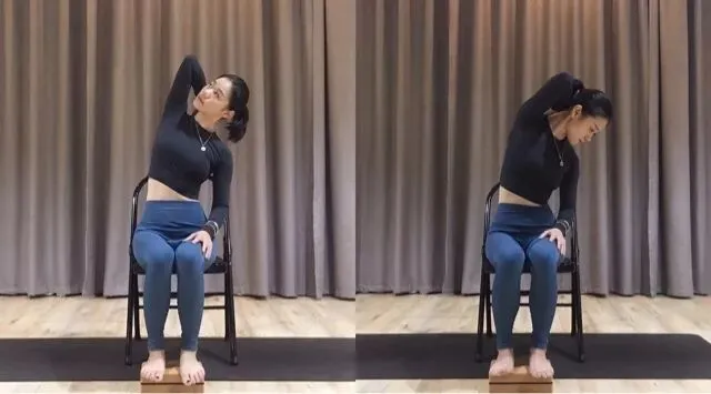 • 右手臂上举,曲手肘,掌心贴上背部,呼气,脊柱向左侧曲,感受右侧手臂、背部轻微拉伸;