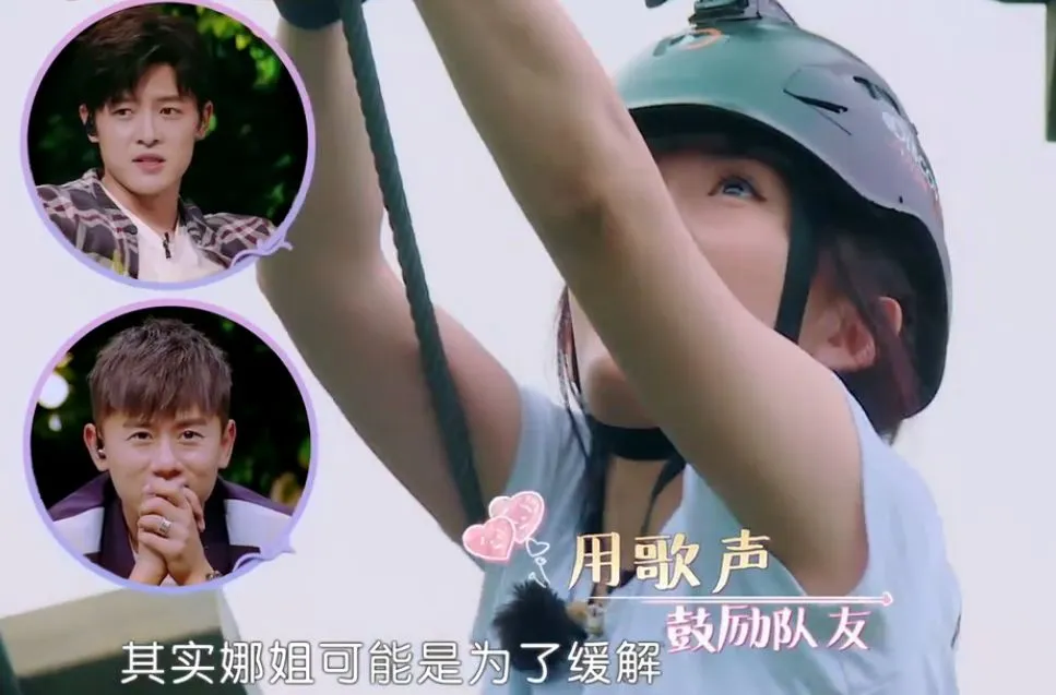 有一期安排了高空项目挑战,大家都很害怕,谢娜自己也怕,但还是唱歌鼓励队友们,帮忙缓解恐惧情绪。