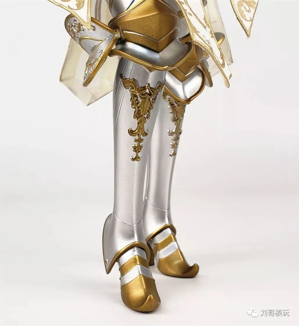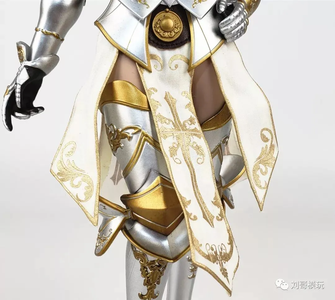 虽然全身铠甲包裹程度很高,不过在裆部,则是六片长短不一白色裙带,这个设计给人偶增添了不少性感。裙带表面有大量金色细节花纹,裙带边缘则埋有小铁丝,可以随意凹造型,对于拍照和摆POSE有不小的帮助!