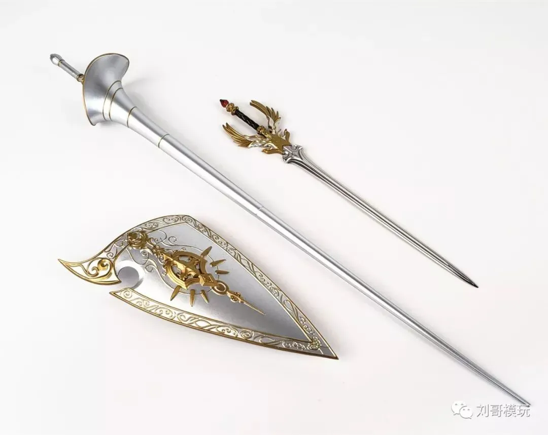 武器配件分别是光明之刃,天使长枪,天使盾牌!光明之刃的剑身采用不锈钢铸造工艺,金属材质,很有质感。长枪和盾牌则是全塑料的材质,造型还是很漂亮的!