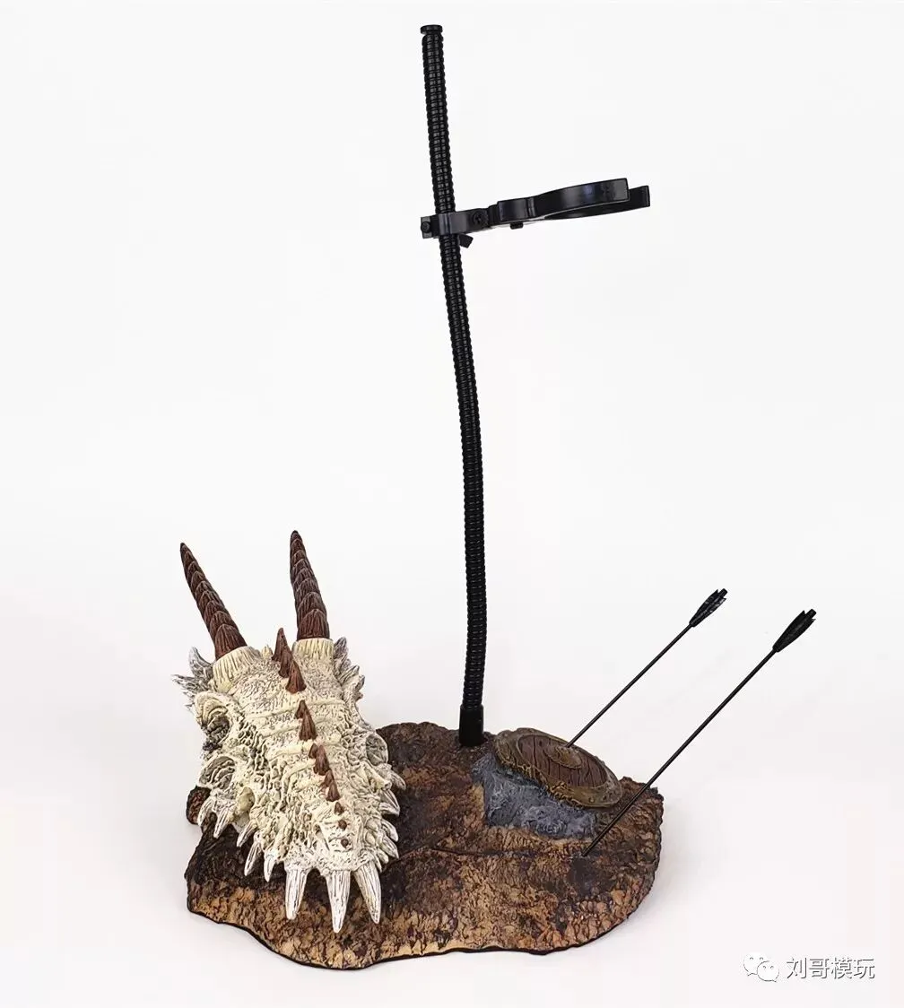 地台配件就比较简单了,支架是金属的万向管设计,支撑力度很好,可以撑起人偶,做出腾空的姿势。下面搭配了两根金属弓箭,有孔洞可以插在地台上。还有一个龙头白骨,毕竟米迦勒是一个屠龙高手,所以带了这个配件也是合乎常理的!