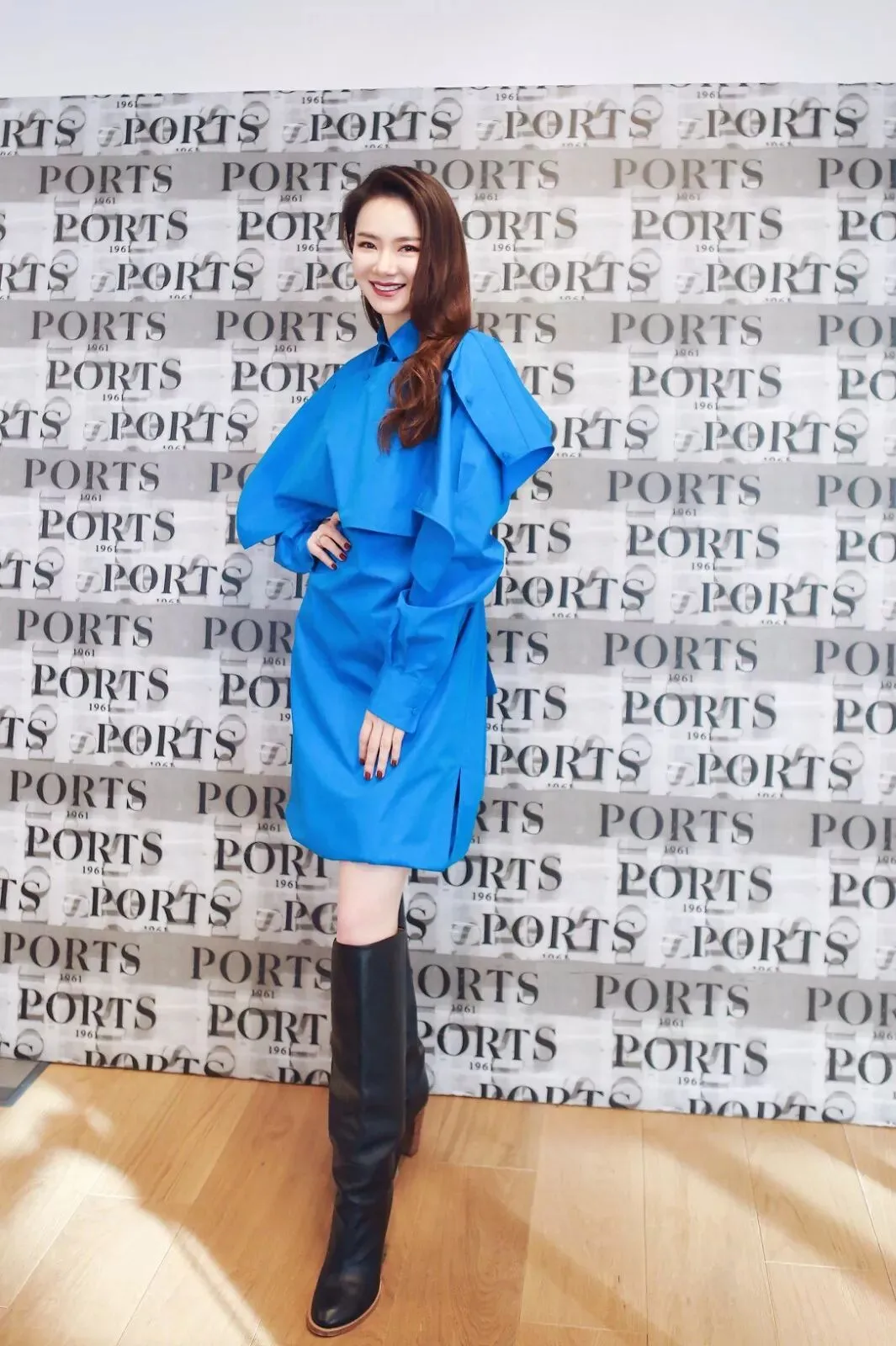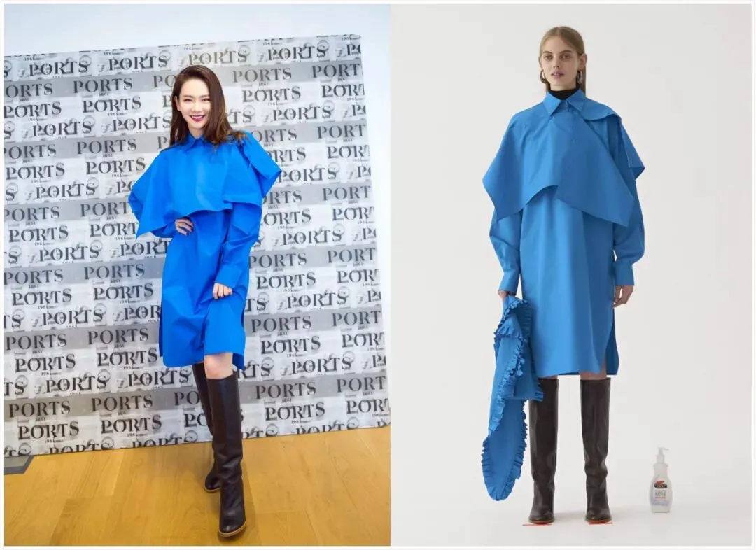 戚薇第一套上身的是一件蓝色的解构主义衬衫裙,这种硬朗的建筑廓形配上摩登瑰丽的色彩,让这件裙子显得有点难驾驭,但是戚哥有着大卷发和黑色长靴压阵,完美的hold住了这一身!
