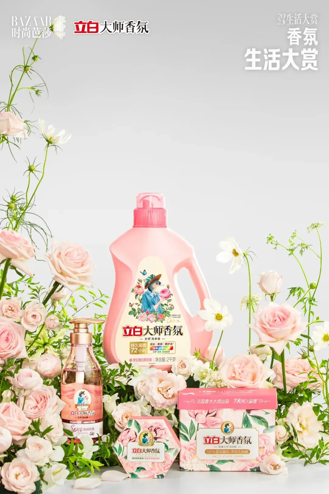 格拉斯玫瑰在香水大师Calice的调制下,更是凝结成了立白大师香氛的香水及洗衣液,以纯粹的格拉斯玫瑰香为基调,搭配蜜桔、青草的清新自然香作为前调,最后以典雅醇厚的广藿香、琥珀收尾