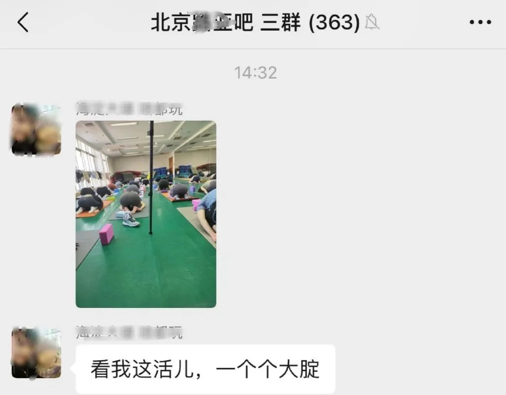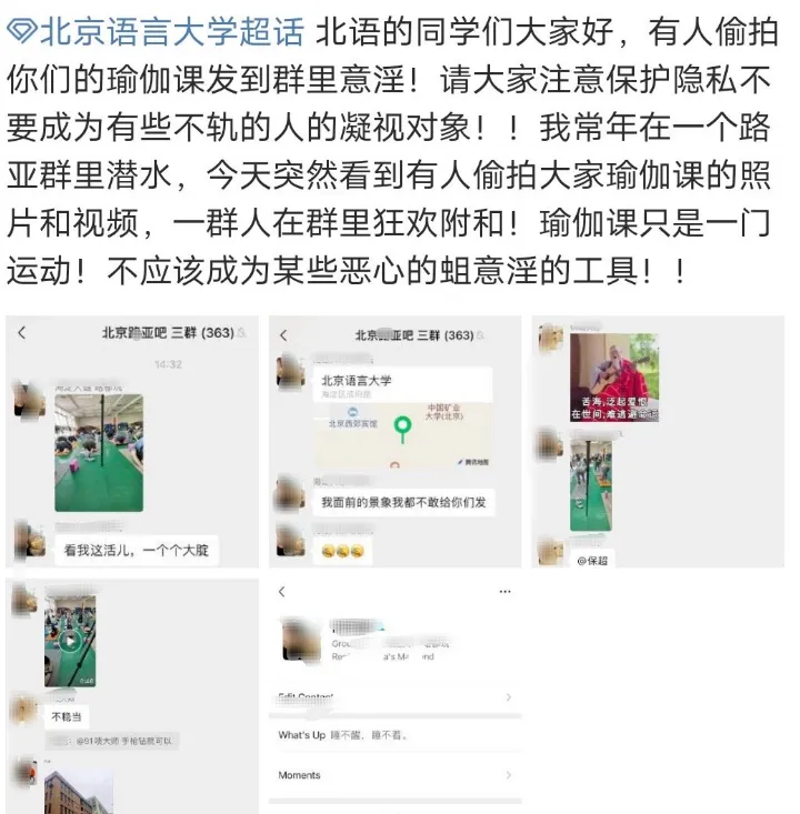 一位某高校的教师被曝偷拍女生上瑜伽课的画面,他同样也是把自己偷拍的照片和视频,分享到了一个有几百人的微信群里。