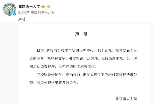这一事件立刻在网络上引发了广泛关注和讨论,面对舆论的压力,北京语言大学随即发表了声明,决定暂停该教师的工作。