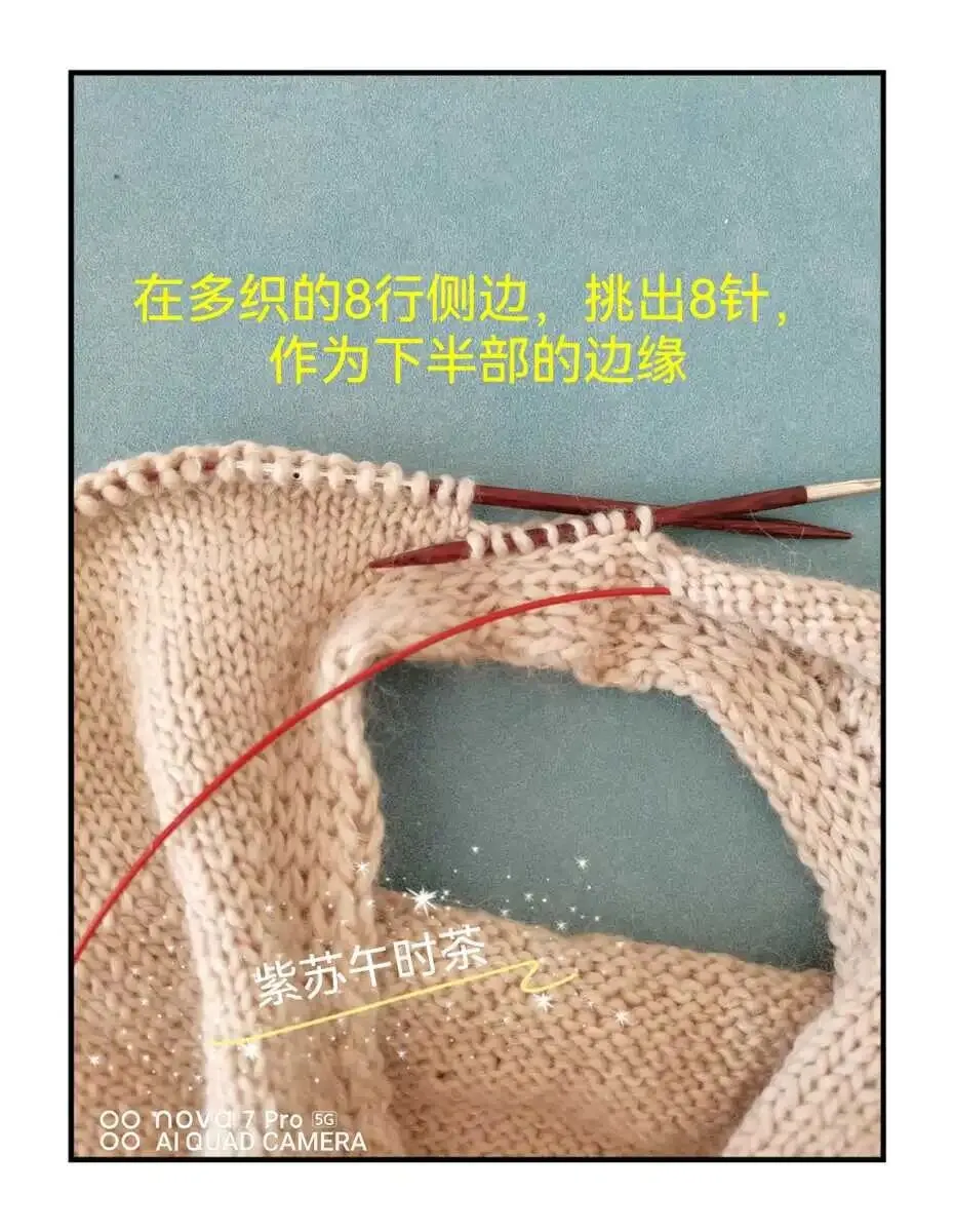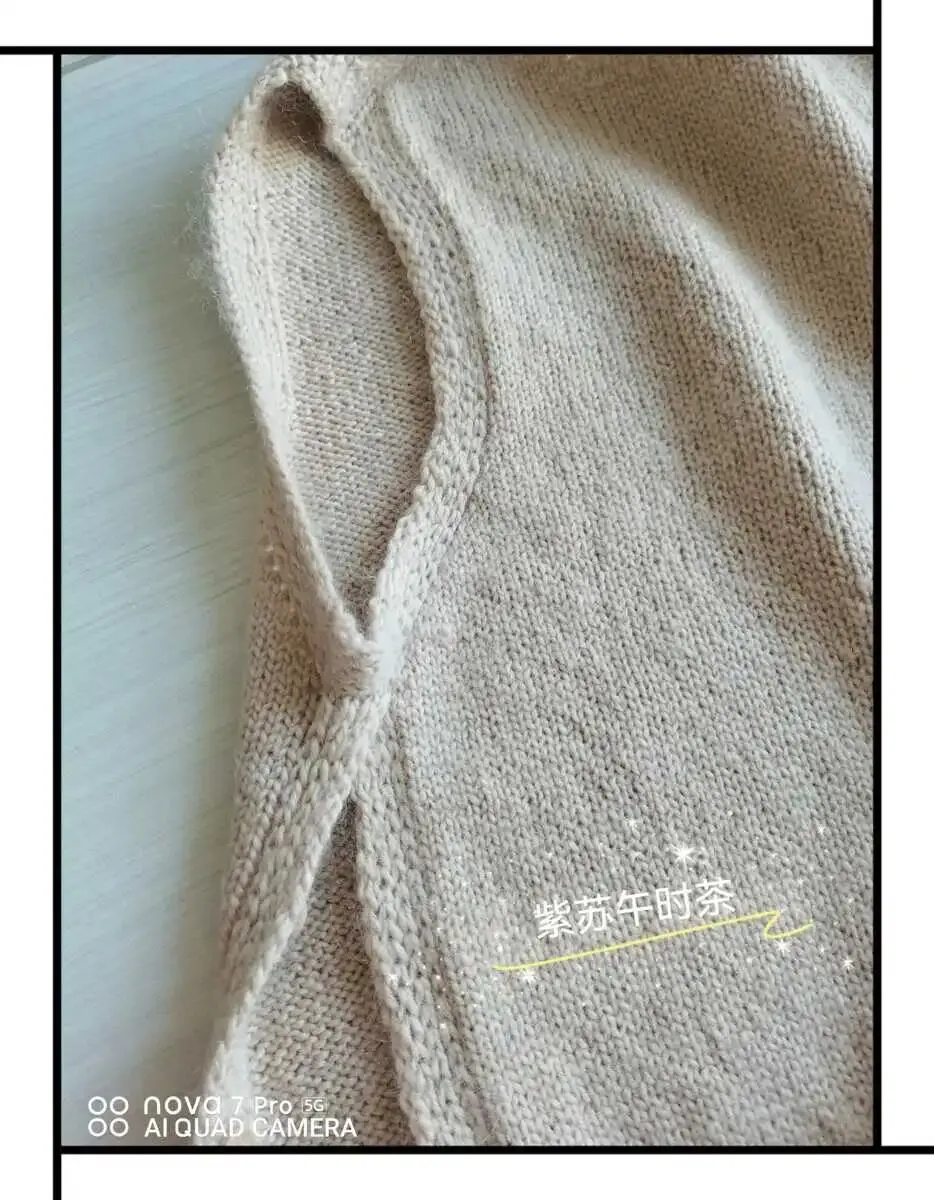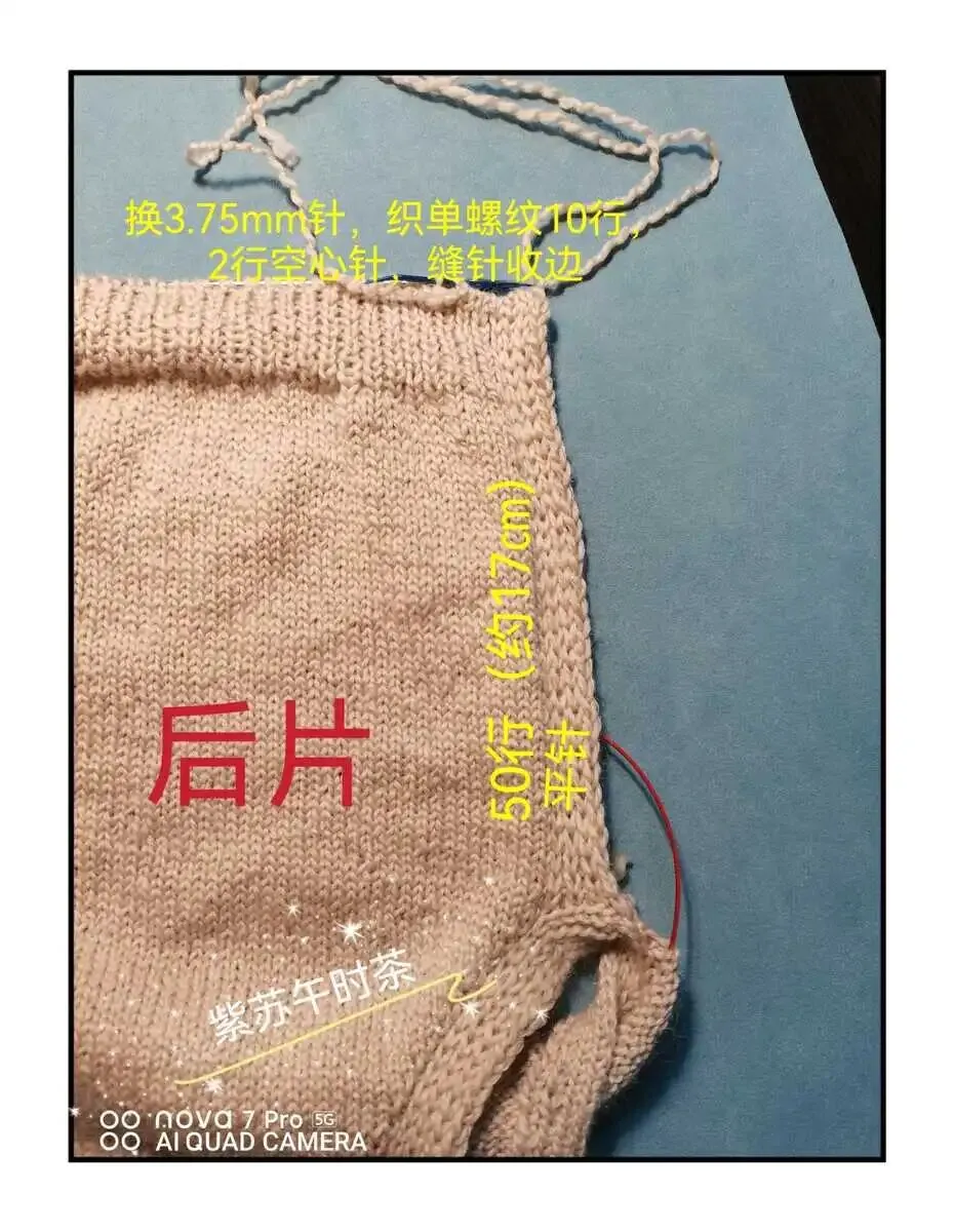 6.)缝合线的线头接上新线,在边缘的侧边挑出8针,作为后片的边缘,接着继续不加不减织腋下腋下部分,织到50行(约17㎝),换3.75mm针,织10行单螺纹,2行空心针,缝针收边。