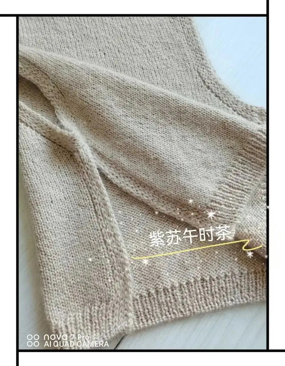 加针的同时,织前领的落差往返:2-1-6,2-2-2,2-3-1,最后前领中间余9针,接着圈织,加针依旧是行行加针。