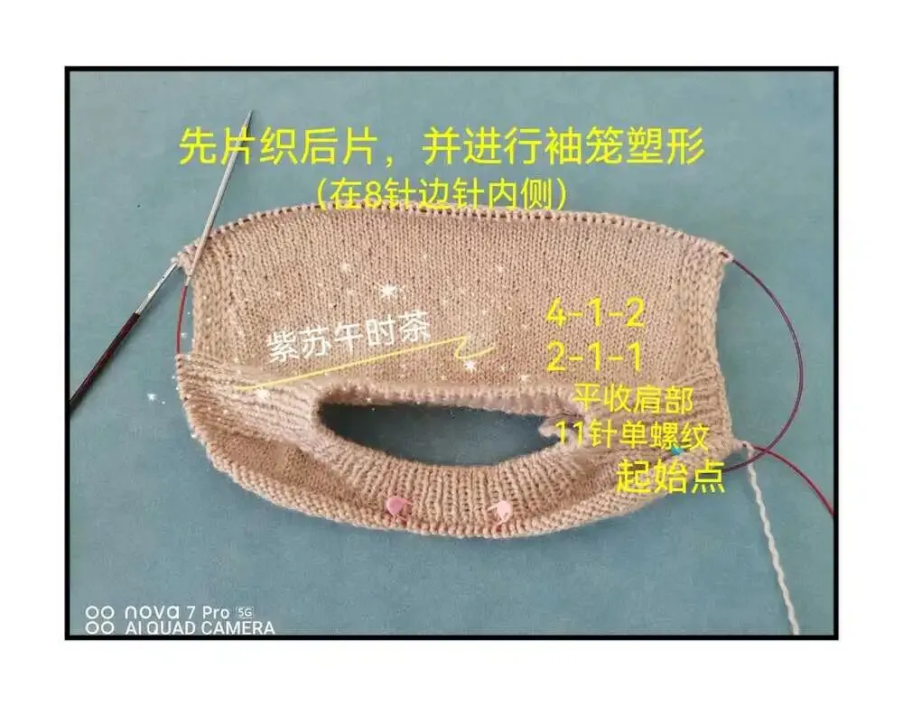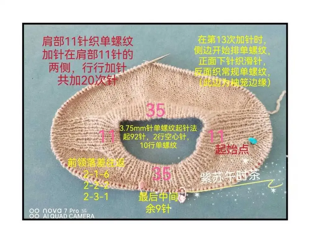 注意:加针都在肩部的11针单螺纹左右,行行加针,也就是正反面都要加针。