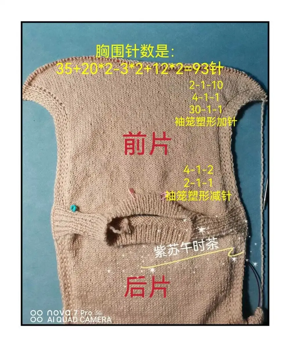 4.)前片:加入新线,在右肩部单螺纹处,按平针套收,再继续织前片,2行后进行袖笼塑形减针:2-1-1,4-1-2.此时前后片针数一样。