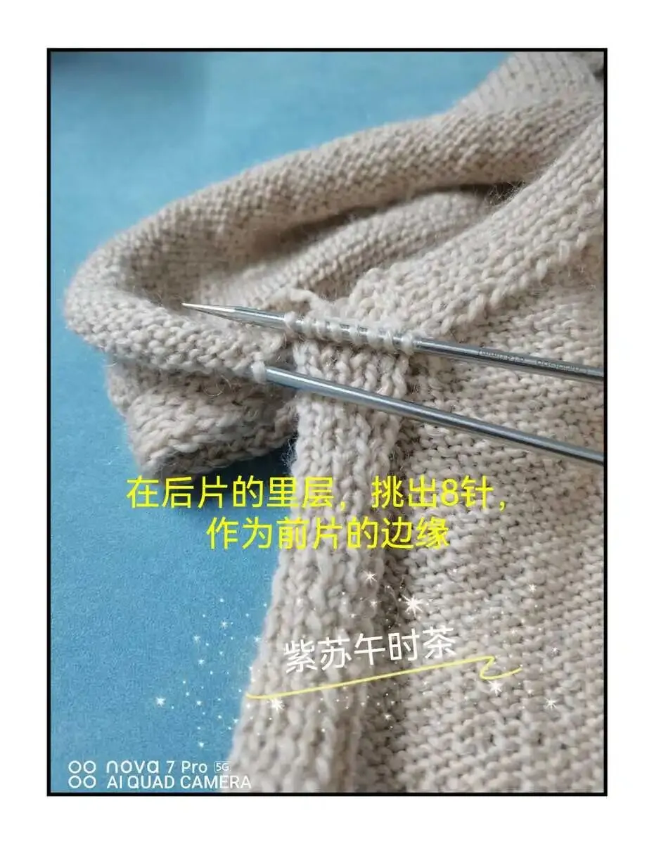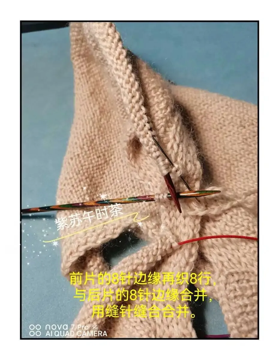 5.)将前片边缘的8针织8行,与后片的8针边缘用缝针缝合。
