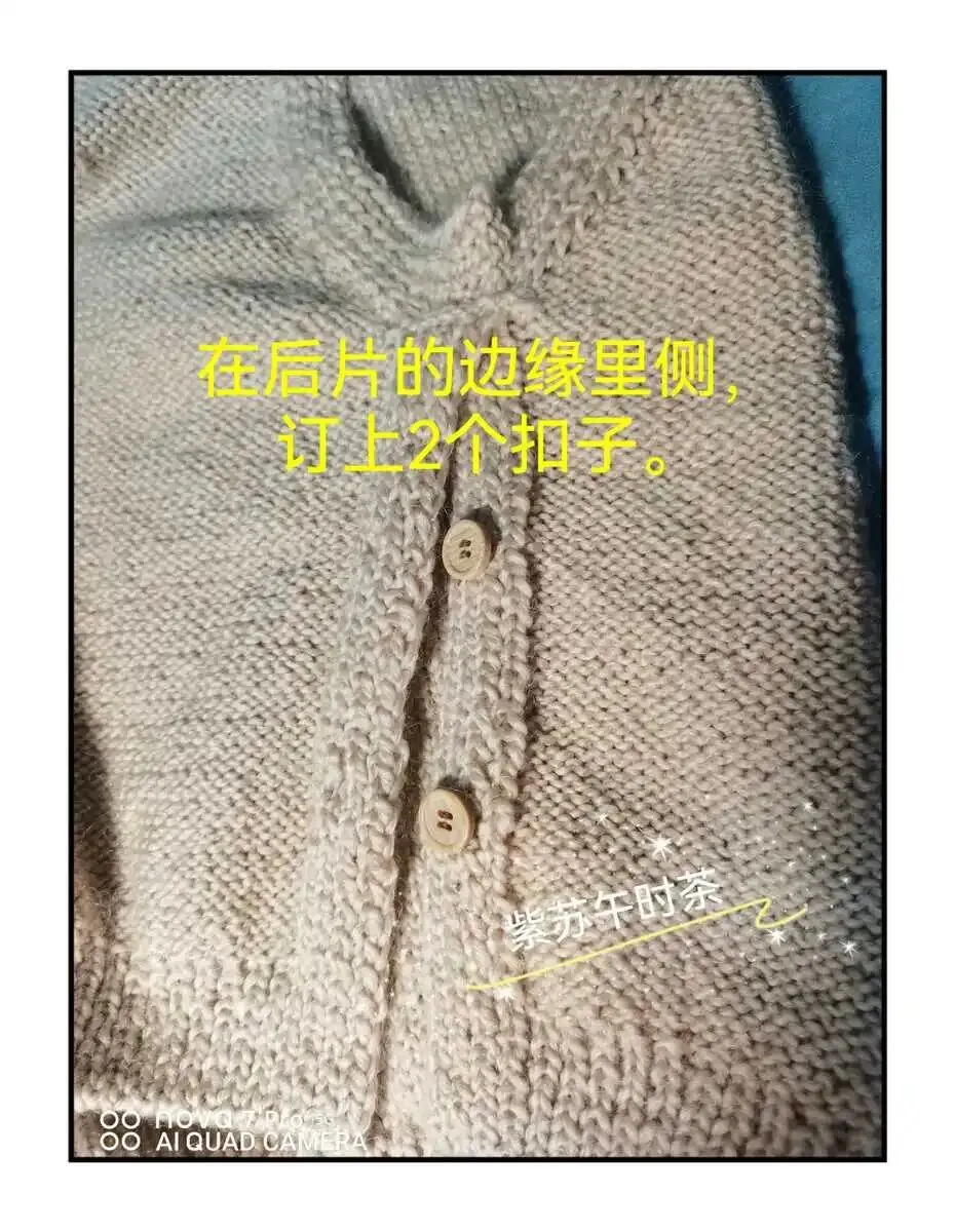 8.)在后片边缘的里侧,订上2个扣子,两侧对称,共4个扣子。