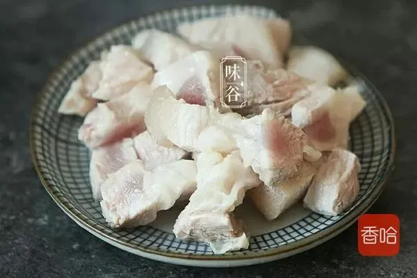 2.五花肉用开水煮一下,捞出来晾凉后切块。
