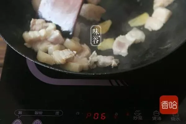 4.锅内放油,放入姜片,倒入五花肉快速翻炒,煸出一点油后调中火。