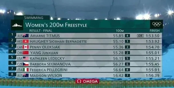 东京奥运女子200米自由泳成绩: