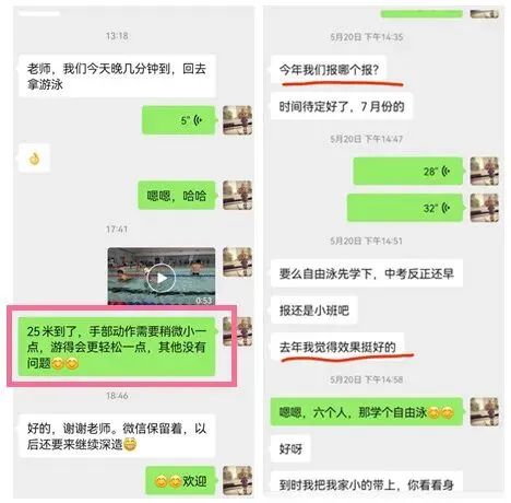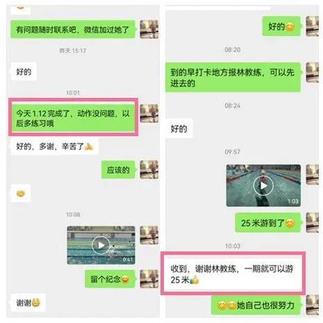 课程结束之后,林教练还会把一些训练的视频和成果一对一的和家长沟通,自己在家游的时候也可以拍个视频,让教练帮忙看看,动作有没有到位哦!
