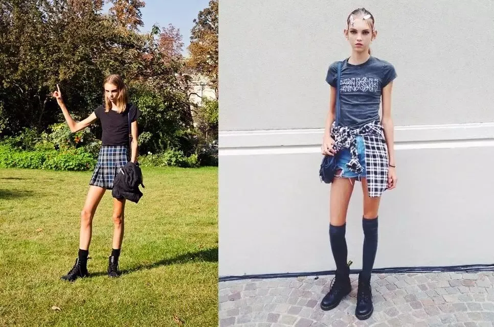 T shirt搭格纹,展现简单随意style,一双细直大长腿已经足够吸引众人目光。