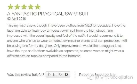 “这是我第一次写评论,尽管我已经在玛莎百货买了几十年东西了。我很喜欢这个泳装,也很满意这个整体的质量以及合身度。我会推荐给任何需要谦逊泳装的人或者想要防晒的人。我还会给我的女儿买一件。唯一需要提升的是,我希望上衣和裤子能分开,毕竟有的女人上衣和裤子穿的尺码不一样。”