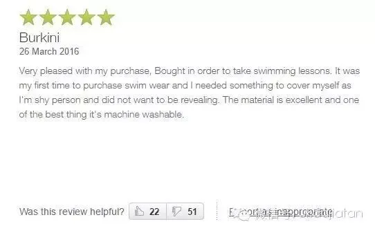 “非常高兴能买到这个burkini,可以让我去上游泳课。这是我第一次买泳衣,我需要一些东西遮住我的身体,因为我非常害羞不想被人审视。这个材质非常好,还可以机洗。”