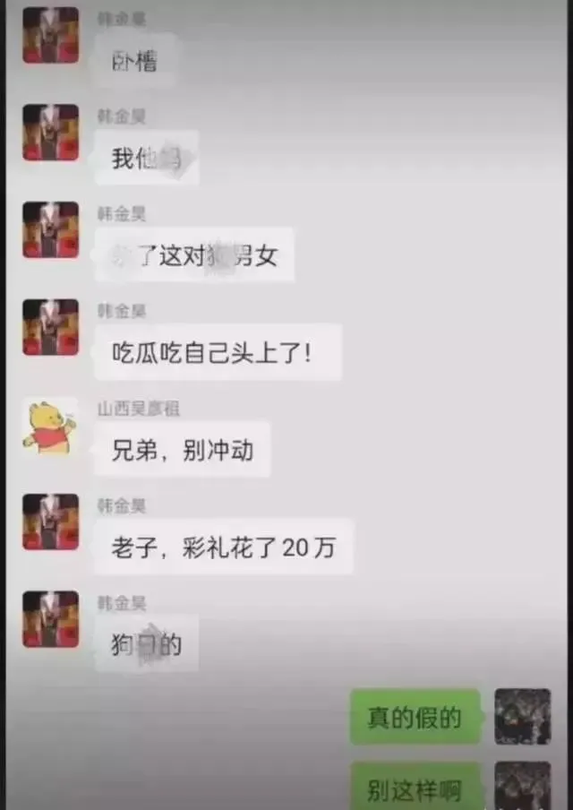 新郎在另一个群里气愤地说,本来婚后的日子甜甜蜜蜜的,没想到吃瓜吃到自己头上,娶新娘他还花了20万的彩礼