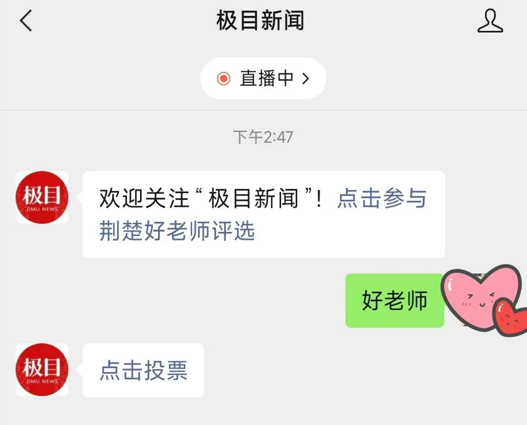 由湖北省教育厅支持,楚天都市报·极目新闻、湖北省教育基金会共同主办的2022“寻访荆楚好老师”推选活动开始了。请进入“极目新闻”官方微信公众号,为你喜爱的好老师投票点赞。