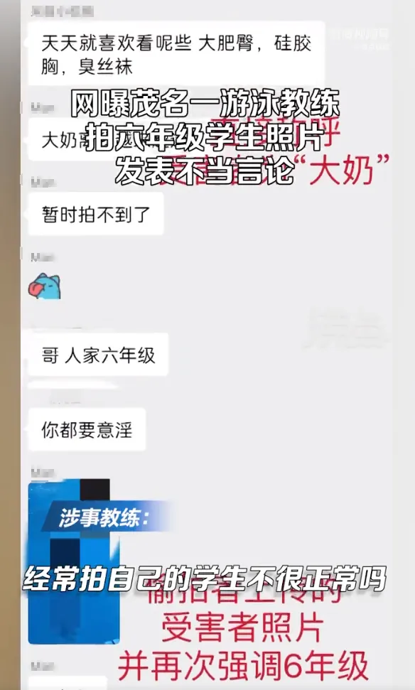 该教练表示:“我们本来就是做泳池的,经常拍自己的学生不是很正常吗?他们说要看下学生什么的,我就拍给他们看呀,又没有什么的,就是小学生而已。聊天记录好像也没有说什么,好像是讨论他们吃得太好,营养太好之类的。”