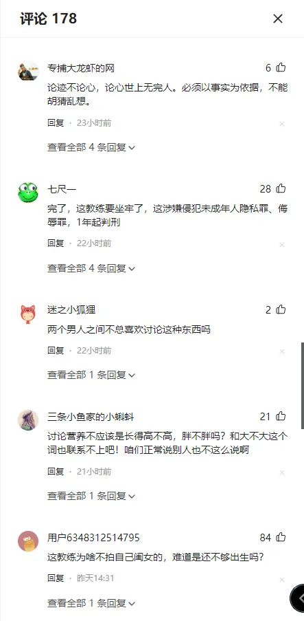 8月8日,涉事教练回应网传聊天记录,他表示,自己当时只是想表达现在的学生营养好,发育好。聊天记录是十几天前的,因群友吵架,才被恶意翻出发到网上来的。自己所在的机构是有证件的正规机构,平常都会拍照片记录学生学习进度,但绝不会拍摄露点照片。