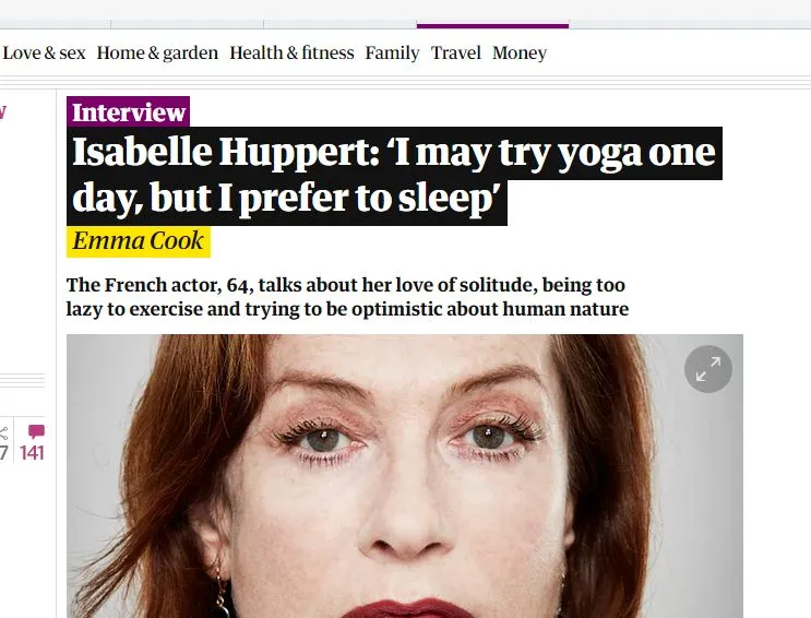 于佩尔曾在一个采访中说:“我很懒,总是不想运动。听说瑜伽对身体很好,也许有一天我会去试试,但我其实更喜欢睡觉。”