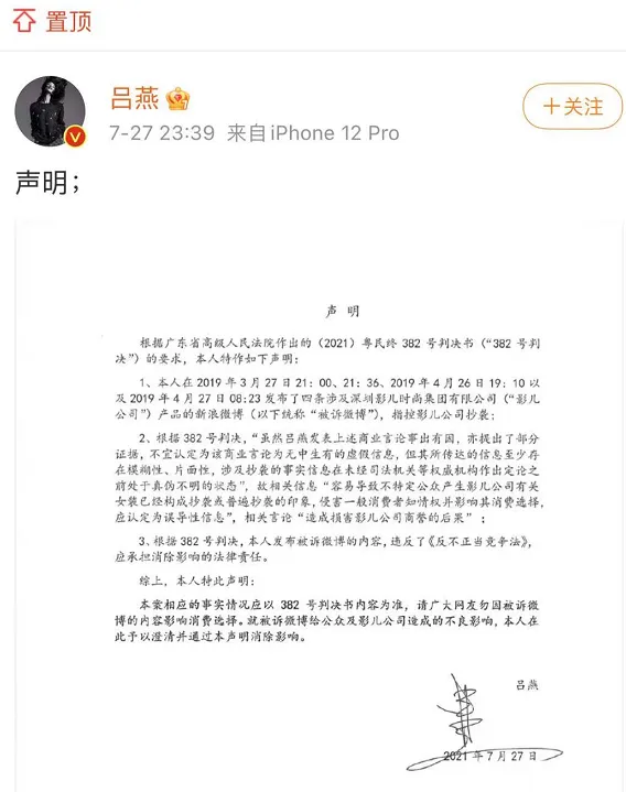 7月27日晚上11时39分,吕燕在自己的新浪微博上置顶发表公开声明称:根据法院有关判决,本人发布被诉微博的内容违反了《反不正当竞争法》,应承担消除影响的责任;本案相应的事实情况应以判决书内容为准,请广大网友切勿因被诉微博的内容影响消费选择;就被诉微博给公众及影儿公司造成的不良影响,本人在此予以澄清并通过声明消除影响。