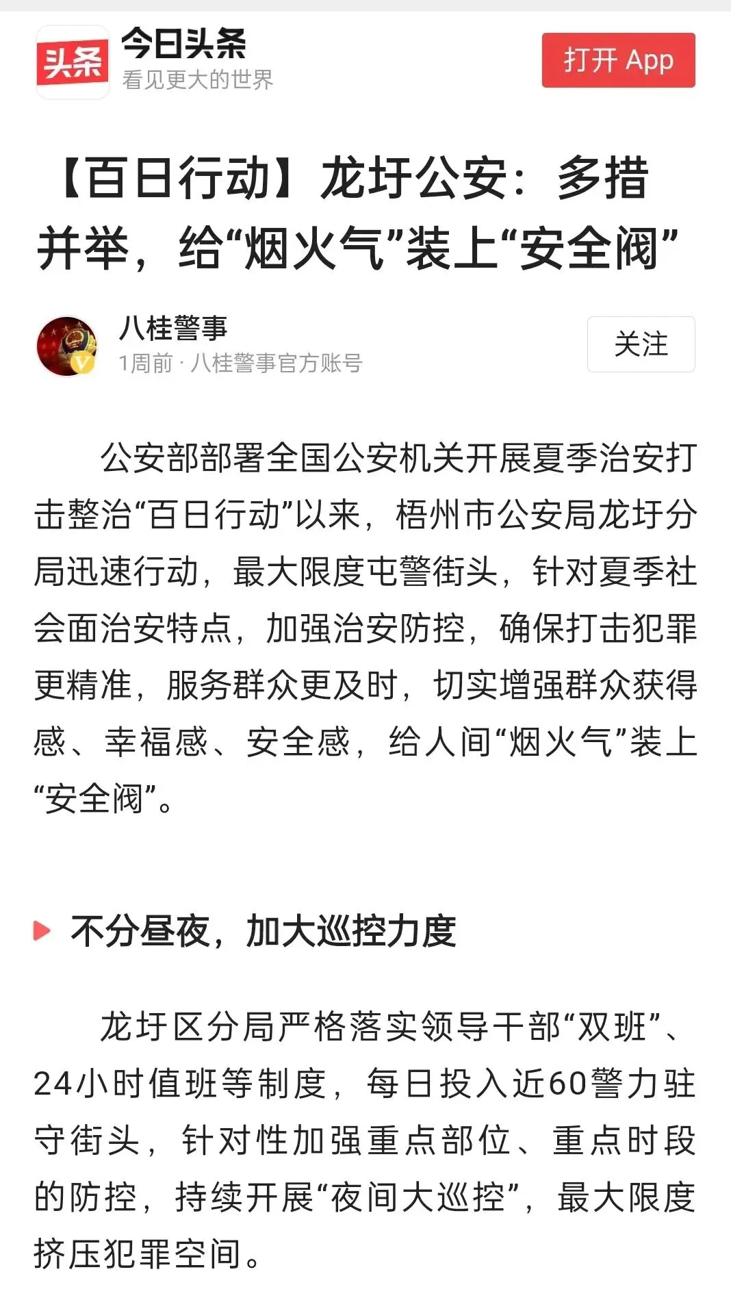 龙圩公安始终同人民群众想在一起、干在一起,以时不我待、奋发有为的精气神,持续提升夏季治安打击整治“百日行动”质效,切实加大打防力度,消除各类风险隐患,全面提升全区人民群众获得感、幸福感、安全感,以优异成绩迎接党的二十大胜利召开!