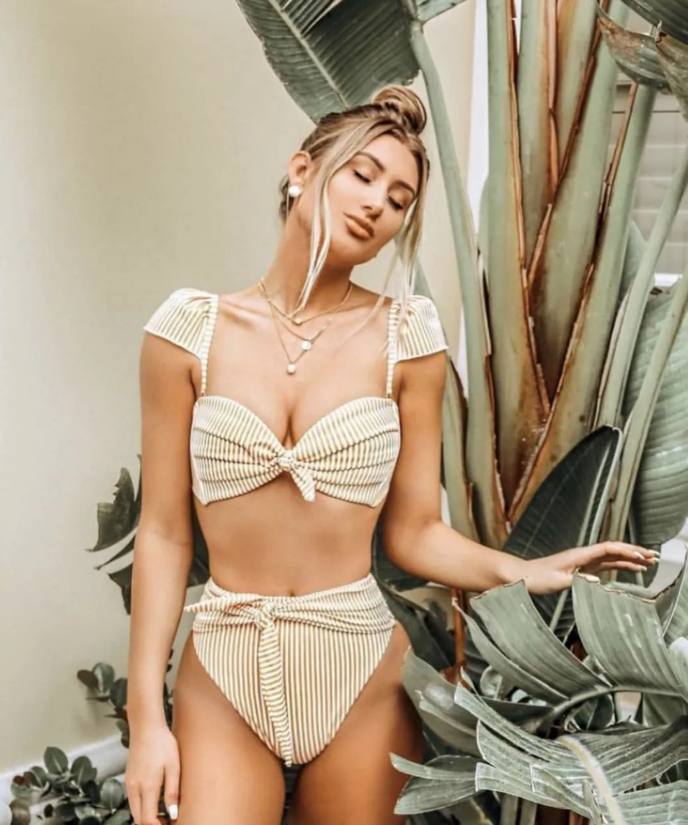 OYE Swimwear上图这一套,侧面是拉高的绑带,腿能拉长很多,上身时交叉绑带,也不显胸小。