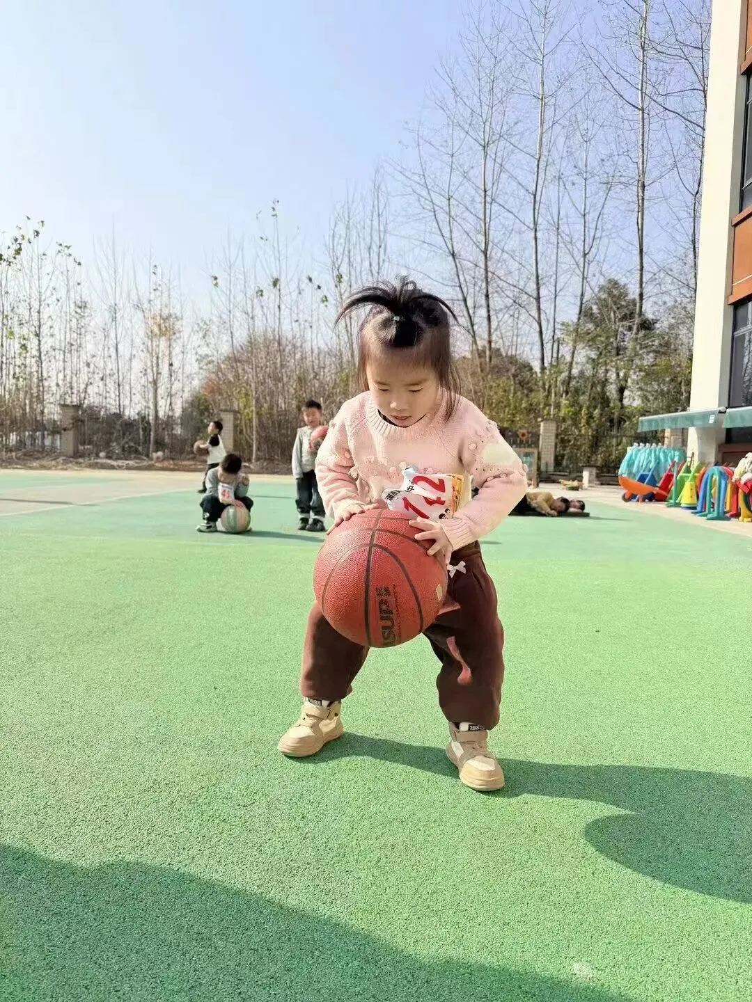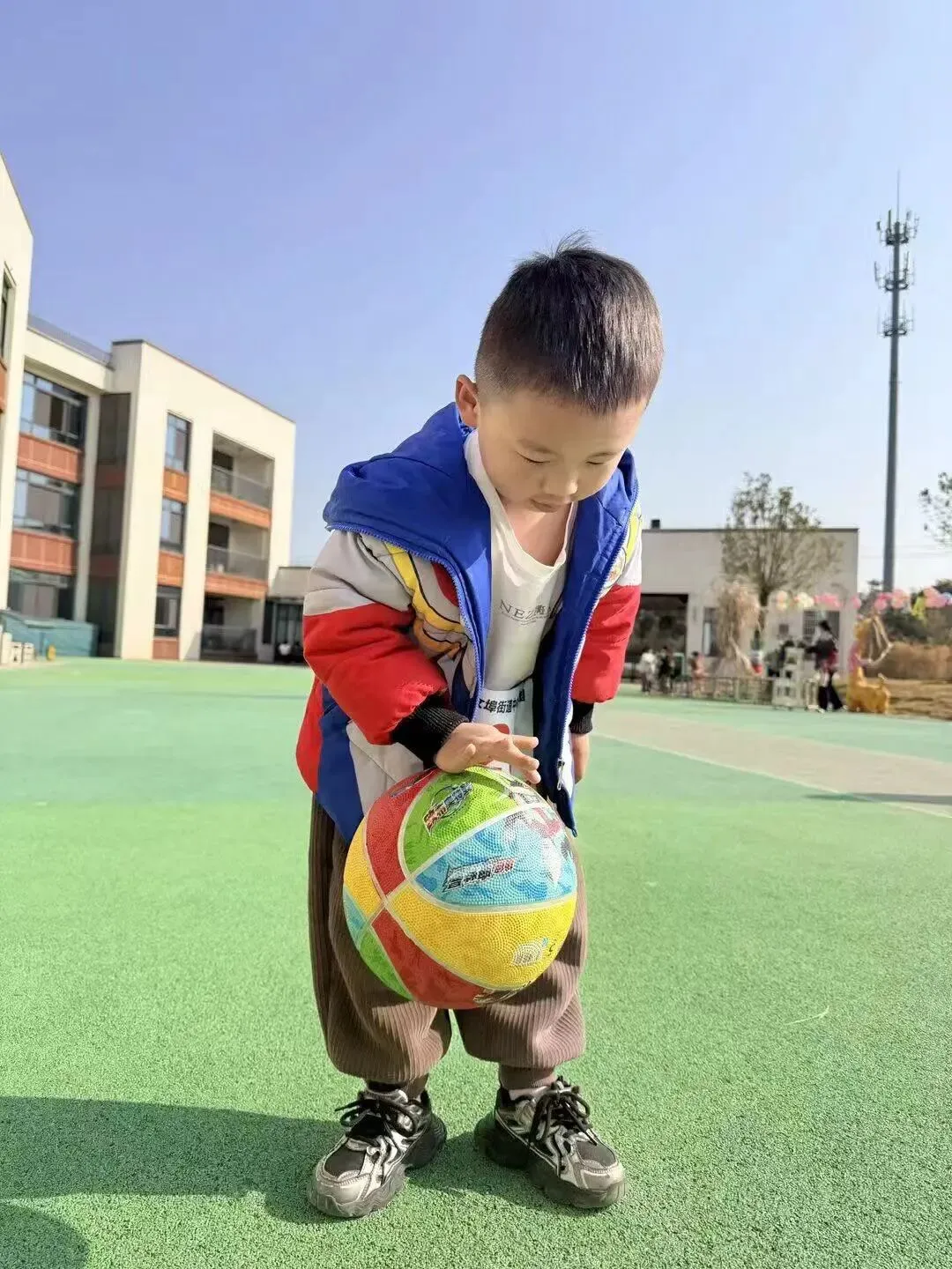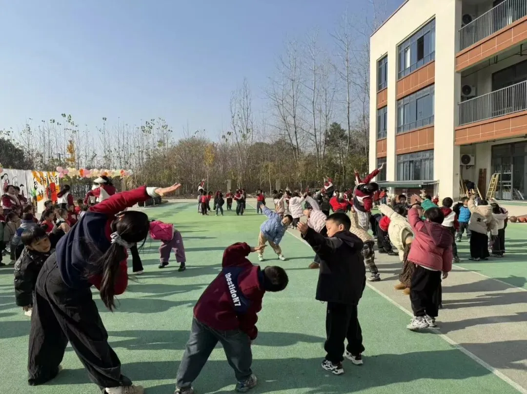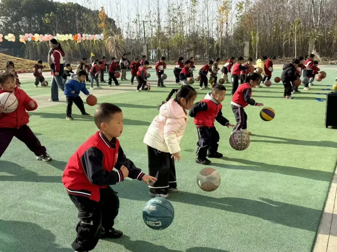 动感十足的早操音乐响起,中大班组的孩子们迈着活泼的步伐登场啦!他们小手有力地摆动,小脚整齐地踏跳,每一个动作都透着认真与活力。彩色的篮球在孩子们手中欢快弹跳,和着节奏划出灵动的弧线,稚嫩的脸庞上满是自信的笑容,把幼儿园早操的童趣与朝气展现得淋漓尽致。