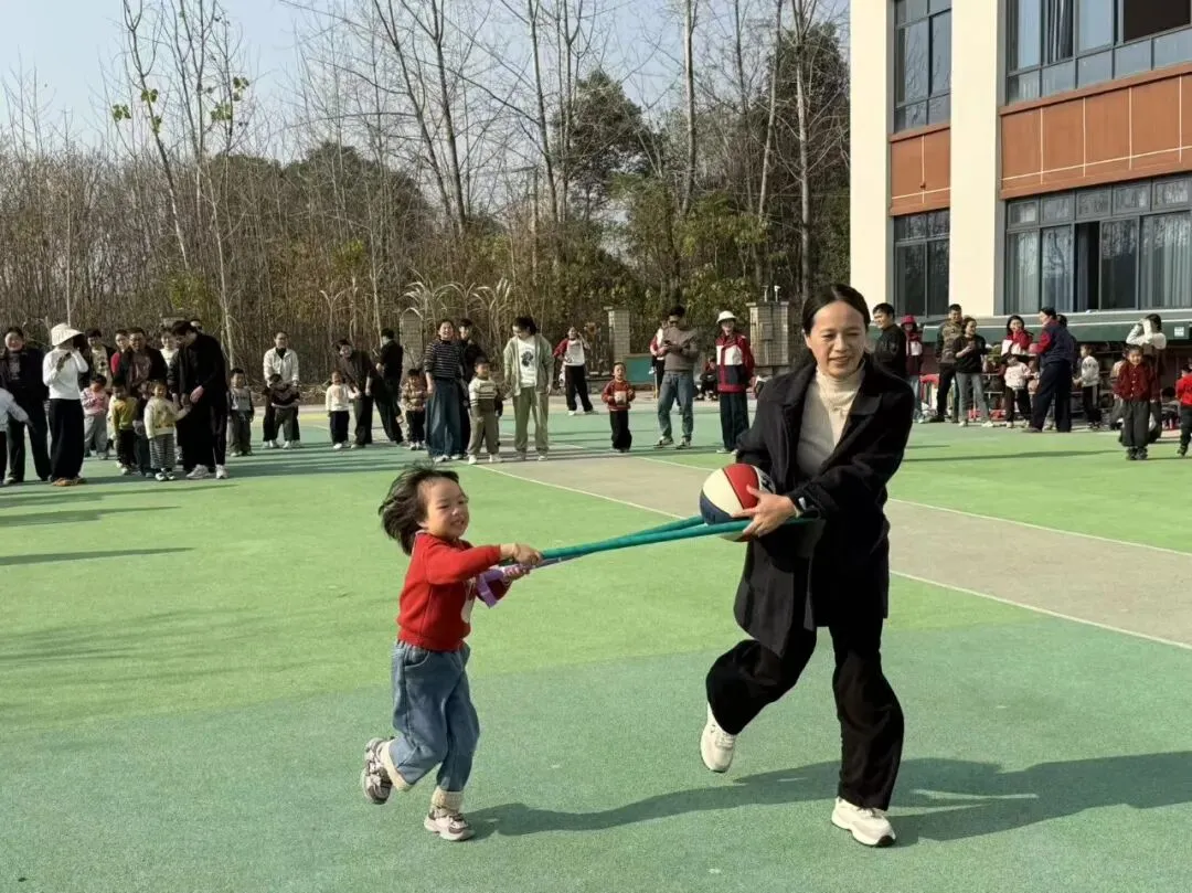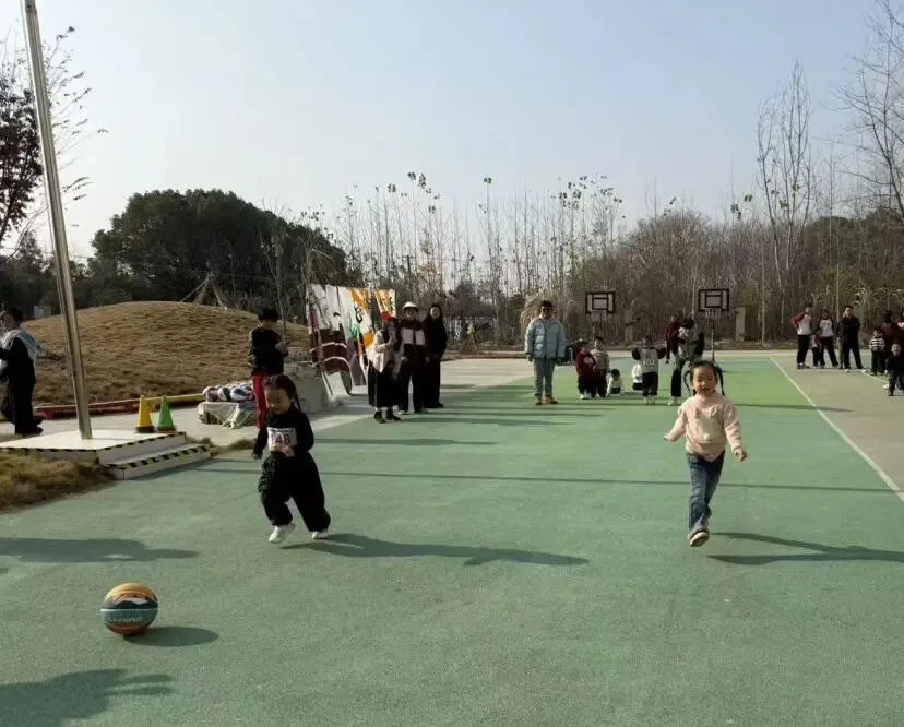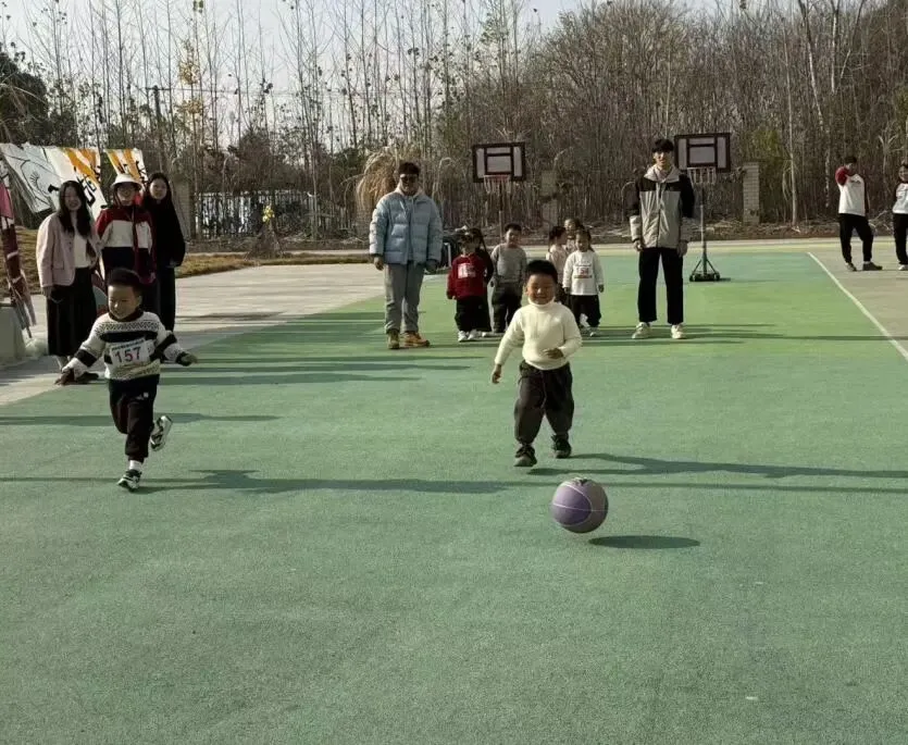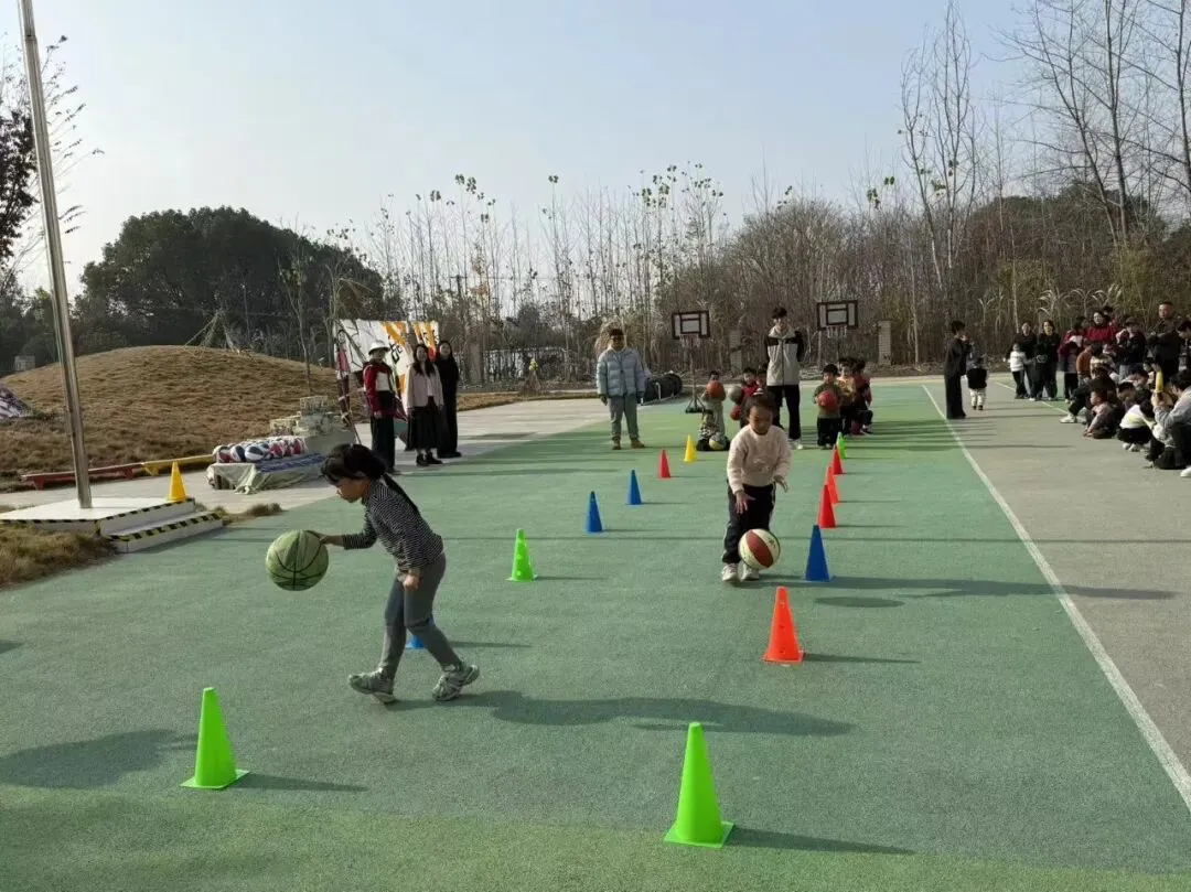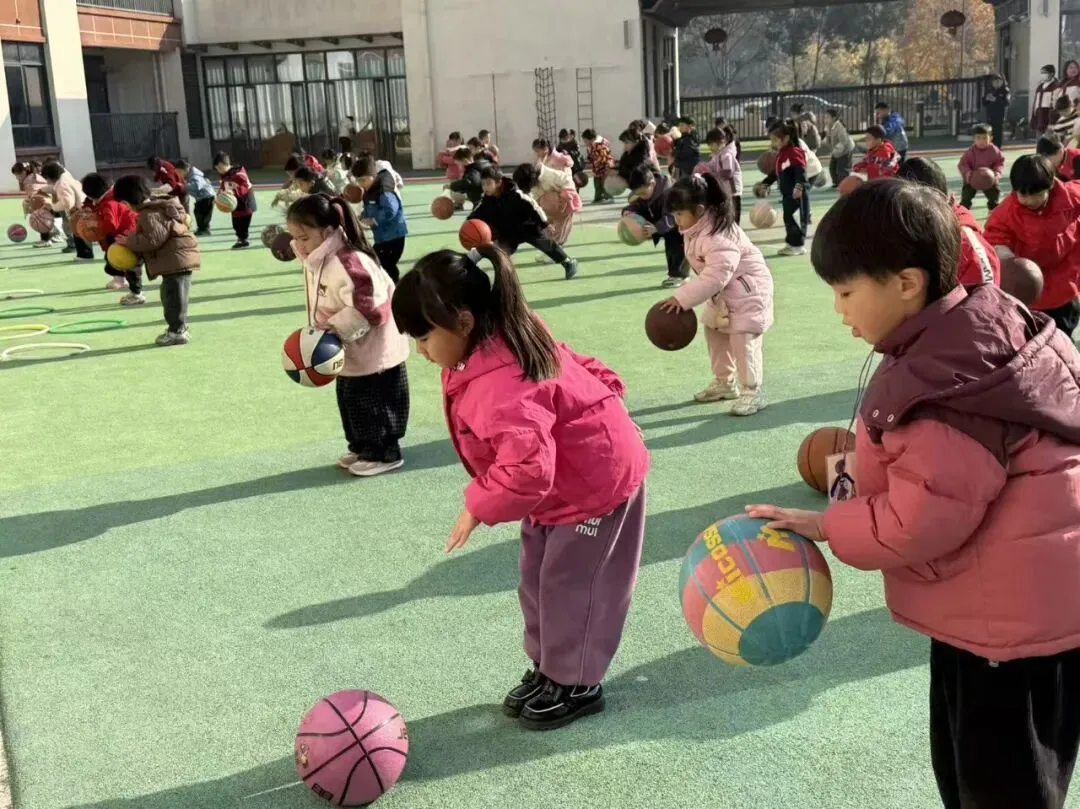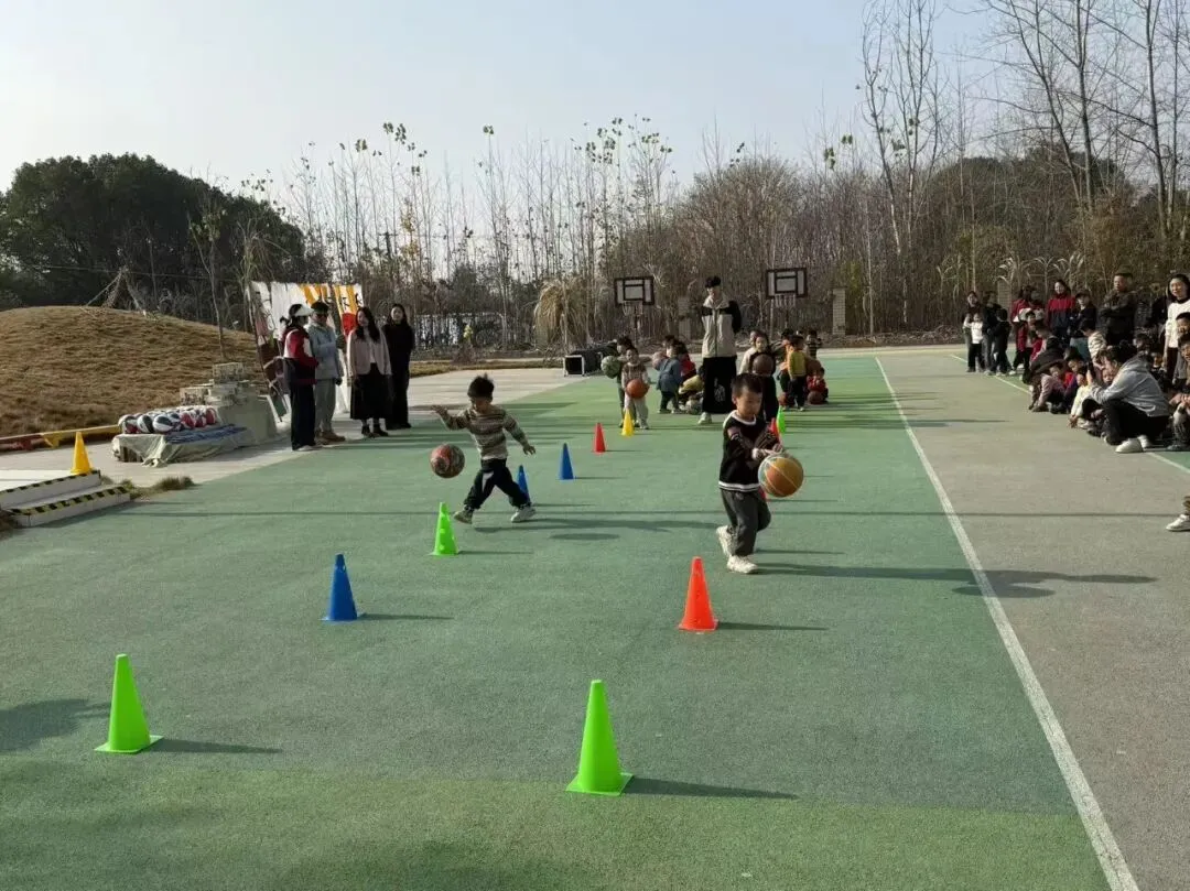 拍球比赛现场格外热闹!中班组的孩子们单手或双手交替拍球,篮球在掌心与地面之间规律弹跳。跳绳赛场跃动着一道道灵动的身影!大班组的小选手们握紧绳柄,双脚轻盈弹跳,彩绳在脚下划出漂亮的圆弧。