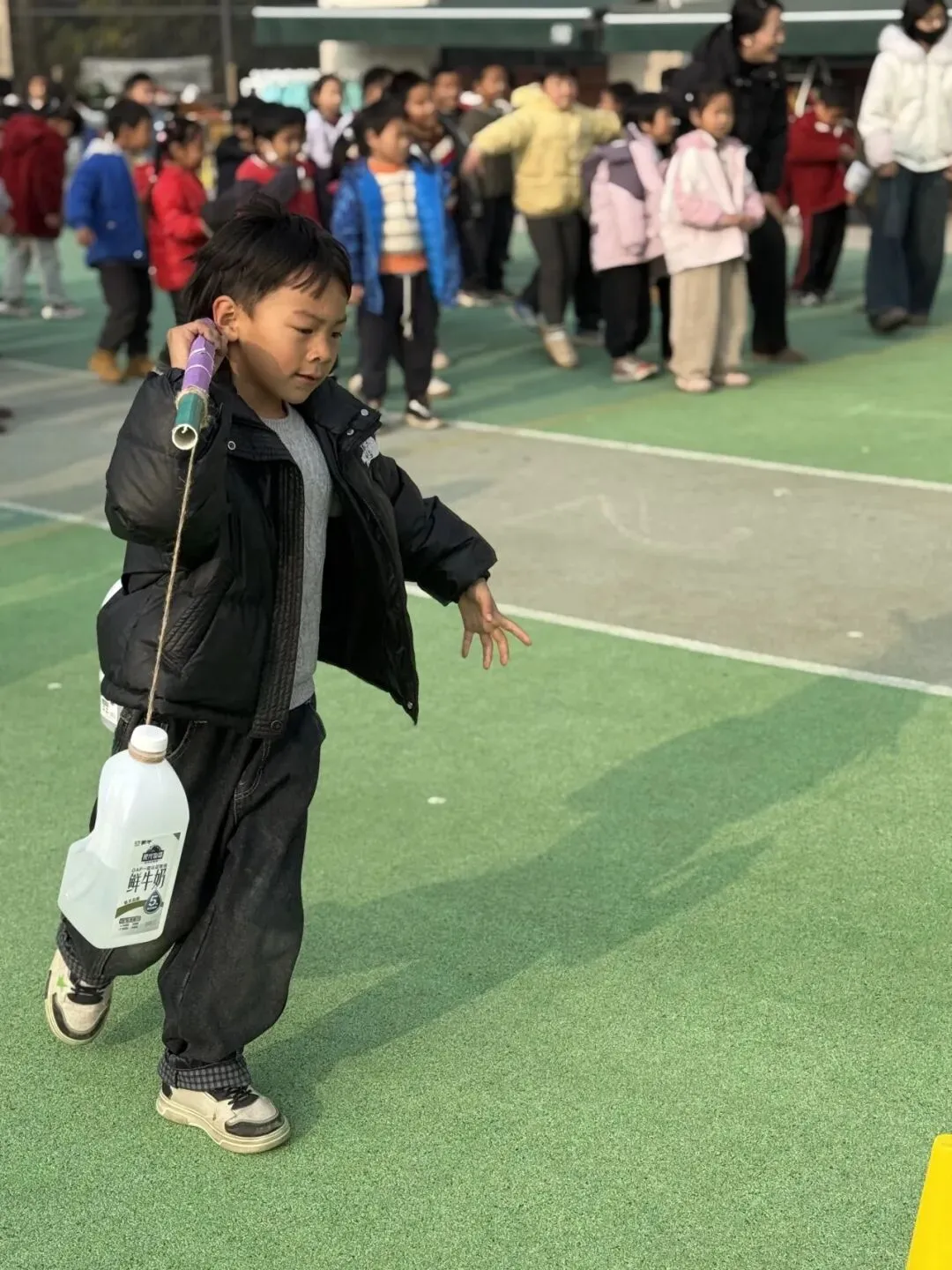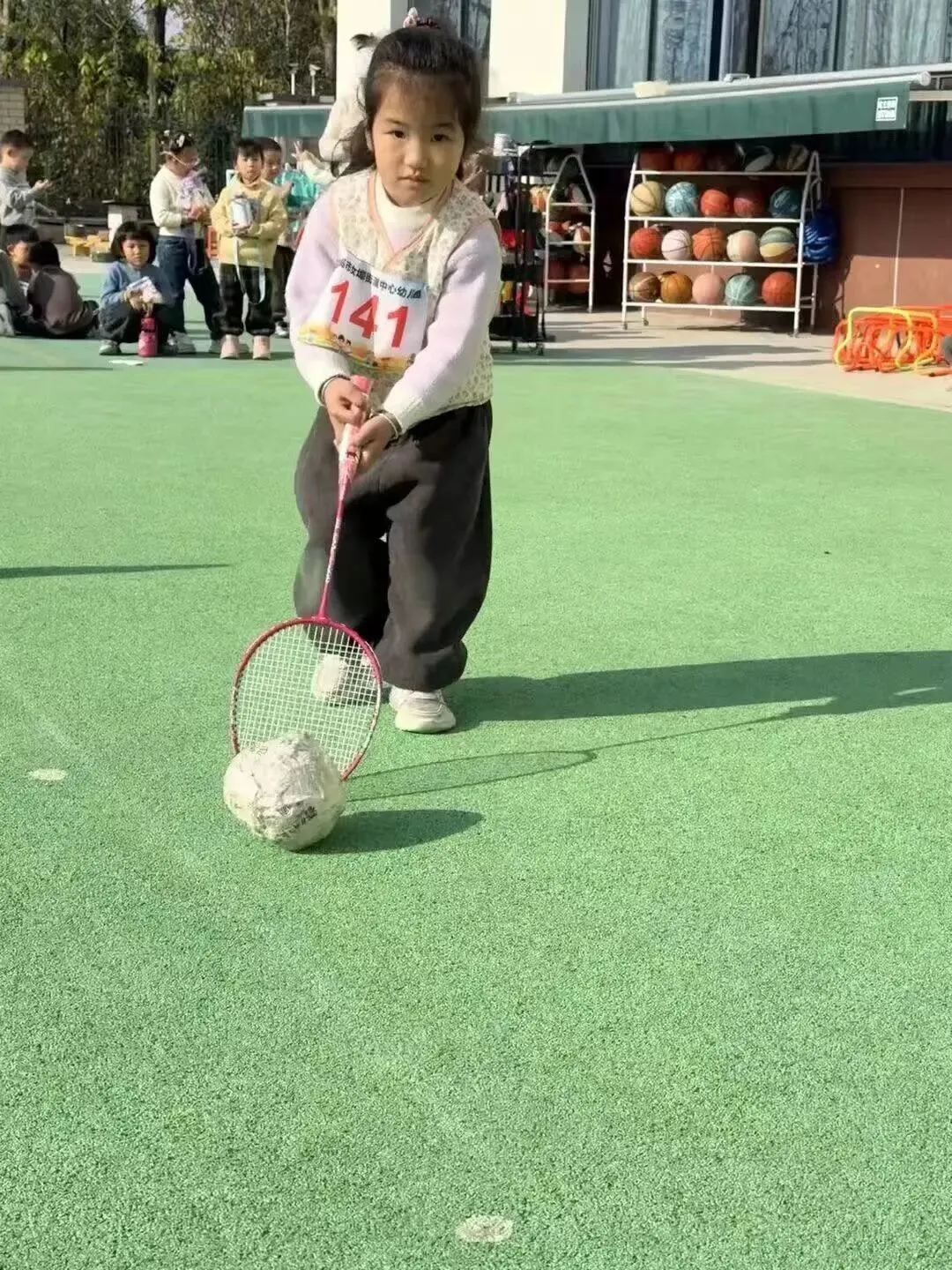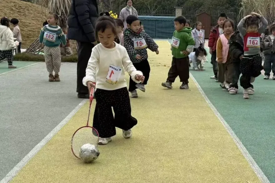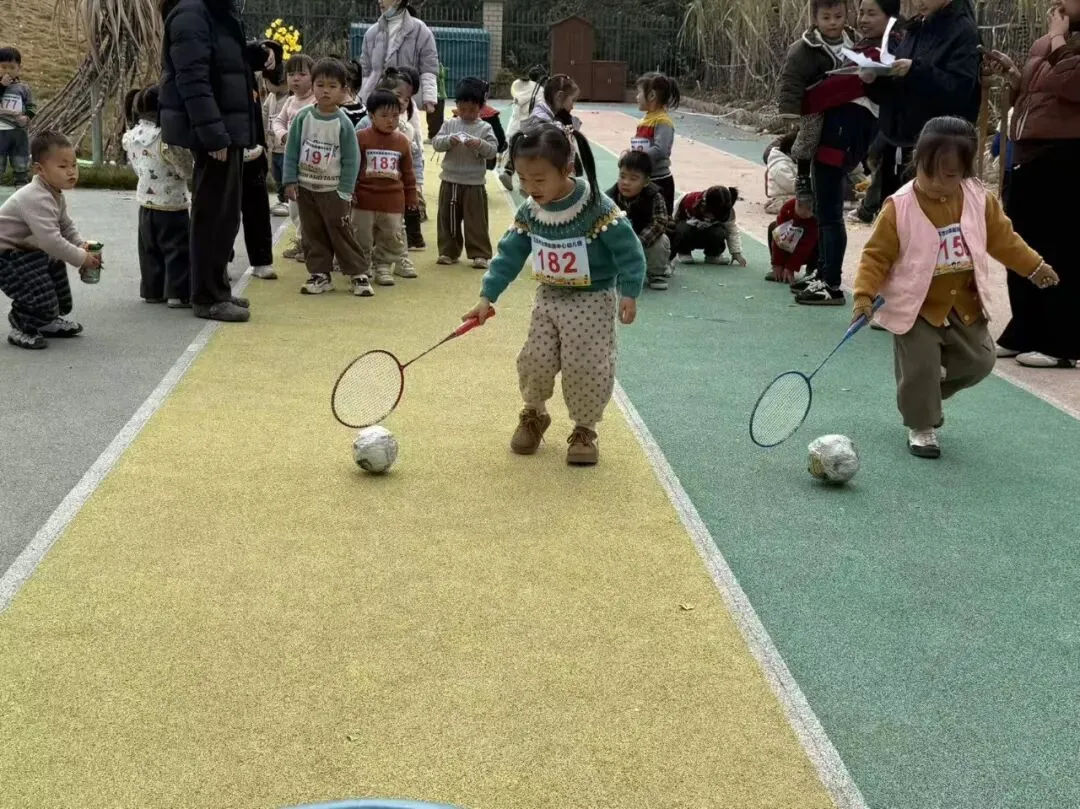 羽毛球拍轻轻挥,小纸球变 “小猪”!萌娃们小手稳稳控拍,追着 “小猪” 向前赶,歪歪扭扭的步伐里,全是认真又可爱的模样。